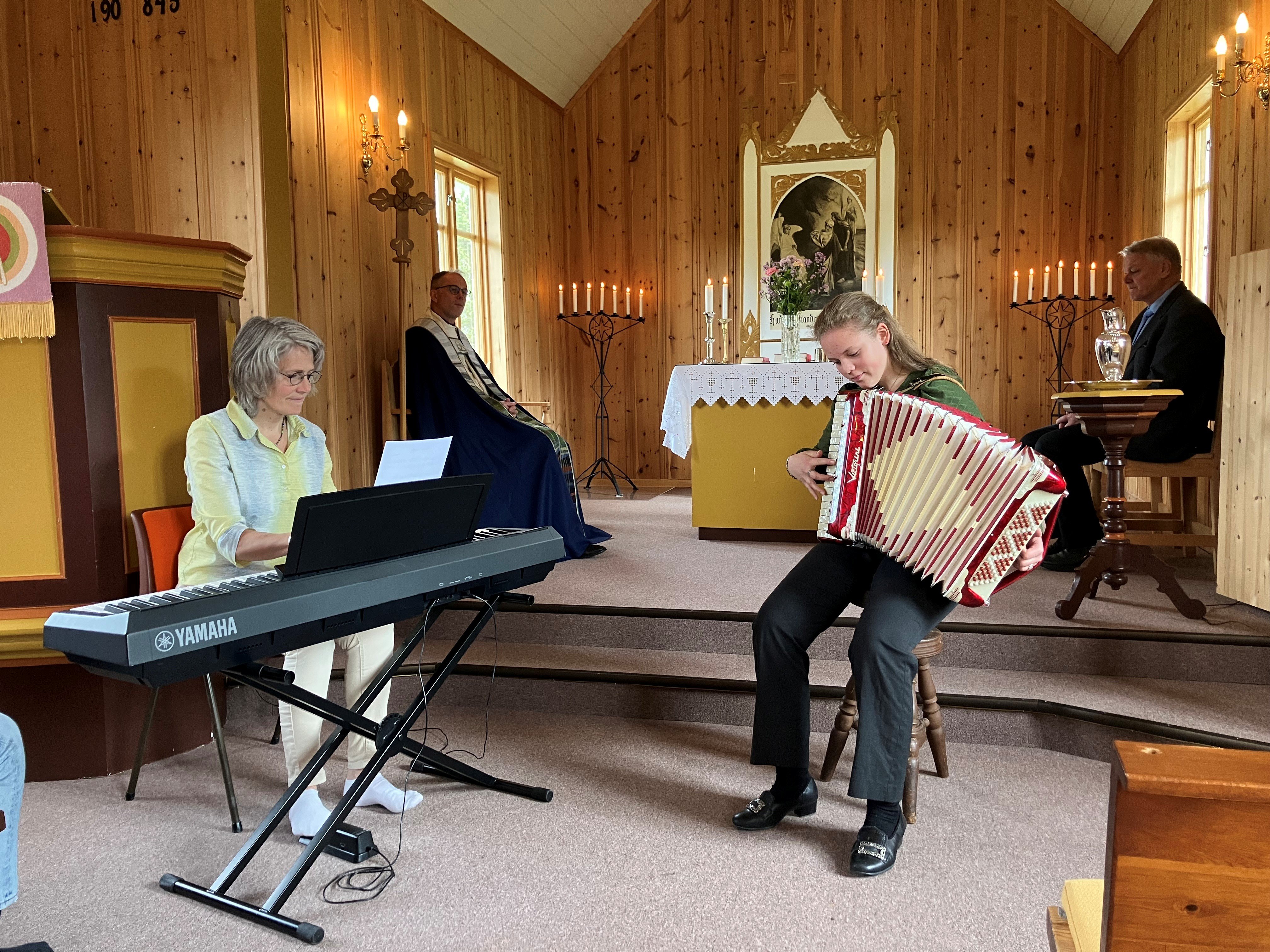 kulturskole deltok med flott trekkspill og flott pianospill. Etter gudstjenesten var det åpen lunsj i samfunnshuset. Bygdekvinnelaget hadde disket opp med sodd, og det var et stort kakebord. Også her ble det musikk og flott solosang fra kulturskolen.
