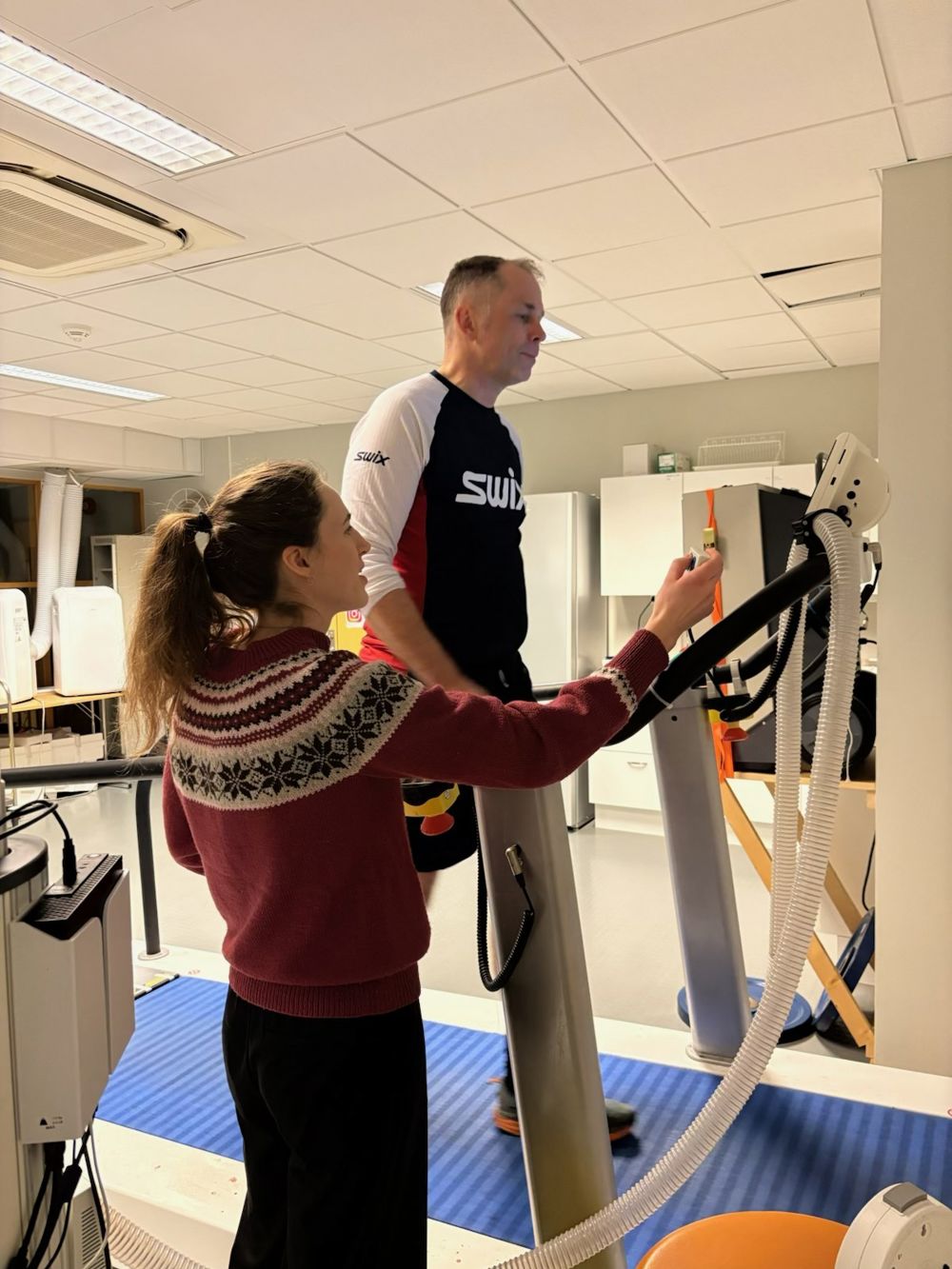 Så ble det tid for å puste og pese litt i testlabben på Universitetet i Innlandet. Først og fremst er dette et imponerende forsknings- og fagmiljø, som driver med testing av alt fra toppidrettsutøvere til helt vanlig folk som ønsker å sjekke hvordan formen er. Jeg gjennomførte en kondisjonstest på mølla, med klype på nesa og pusterør i munnen. Slitsomt, men veldig gøy å ha prøvd en sånn test.