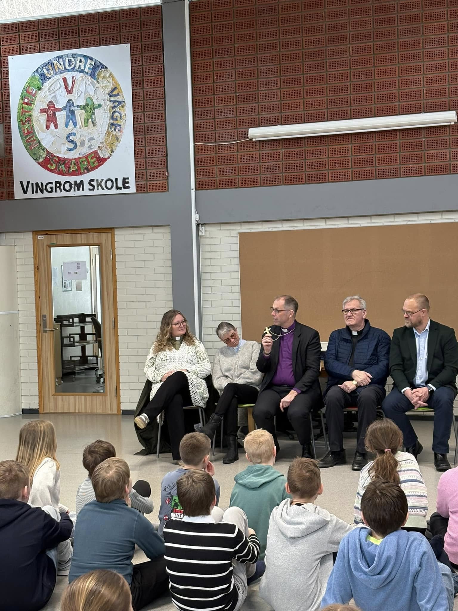 Ett av mange høydepunkt under visitasen var besøket på Vingrom skole. Vi fikk en god samtale med ledelsen ved skolen om potensiale for økt samarbeid mellom skole og kirke for å bidra til å oppfylle læringsmålene i skolens planverk, og i Den norske kirkes nylig vedtatte plan for kirkelig undervisning og læring. Deretter møtte jeg elevene på 5., 6. og 7. trinn, som “grilla” biskopen med spørsmål om ulike temaer. Jeg svarte etter beste evne, og fikk en god samtale med barna.