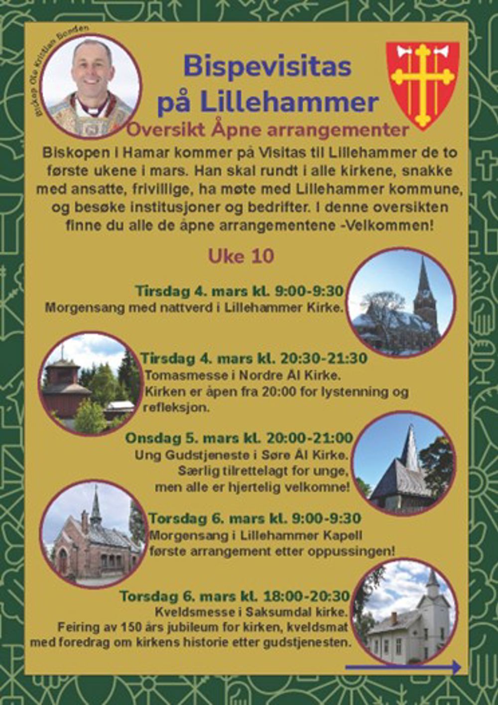 Midt i sentrum ligger Lillehammer kirke, bygd i 1882. Den ligger der som et tydelig bevis på evangeliets tilstedeværelse midt i folks liv. Den ligger der som en påminnelse om tro, håp og kjærlighet - i grå og lyse dager. Visitasen fikk en god start med morgensang med nattverd i denne flotte kirka. Det er ikke mange ting som skaper mer fellesskap enn det vi finner rundt nattverdbordet – verdens mest rettferdige måltid.