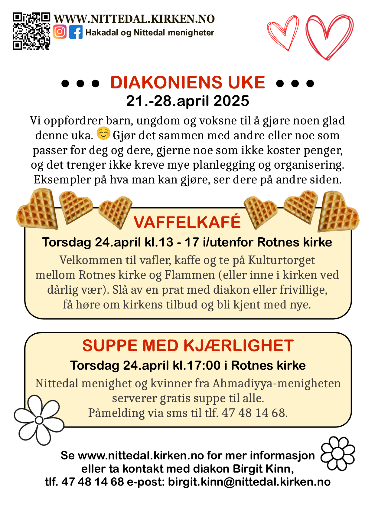 - Bruk anledning til å praktisere diakoni; gjøre andre glade (Nittedal og Hakadal), dele ut roser (Skedsmo) eller gratisuka i Fjellhamar.