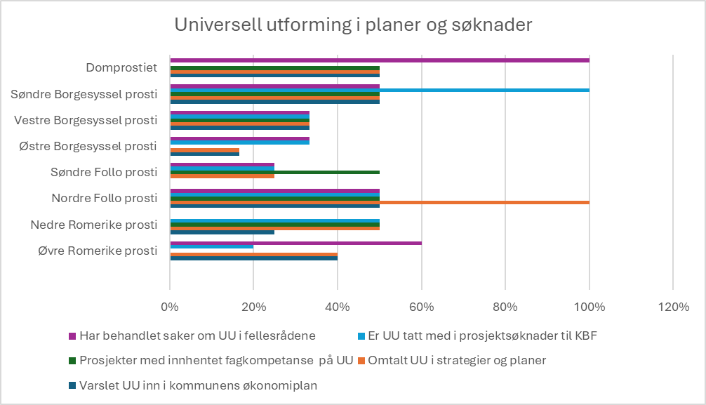 I årsmeldingen har vi spurt alle kirkevergene om hvordan deres fellesråd arbeider planmessig for å sette universell utforming på dagsordenen. Under presenteres en oversikt på prostinivå, som gir et verdifullt bilde av både engasjement, framdrift og potensial.