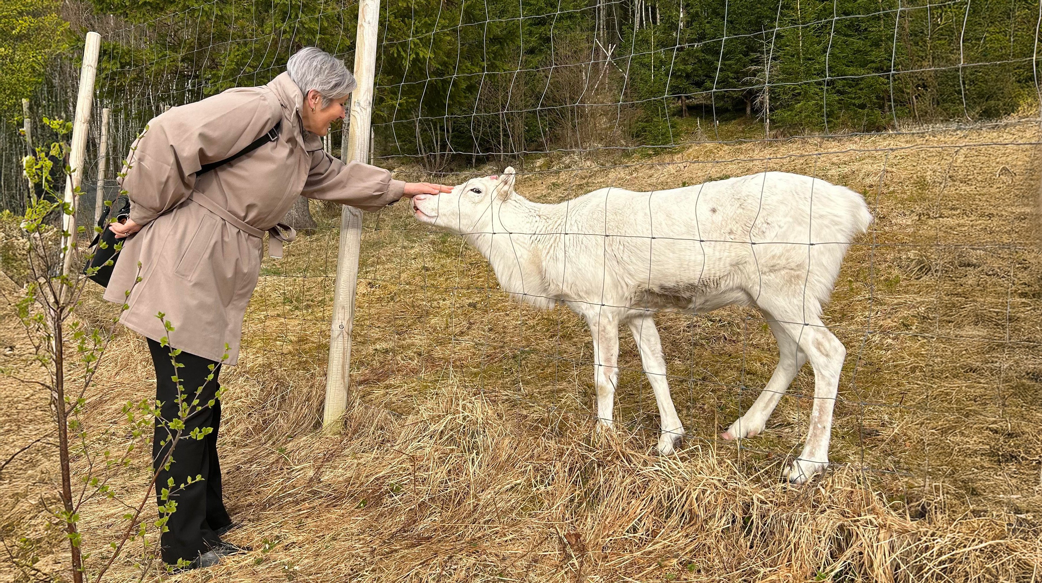 Tamreinen Snøhvit er en del av miljøet på Hundset. Biskopen fikk også hilse på. (Foto: Tina Møllersdatter Solbakken)