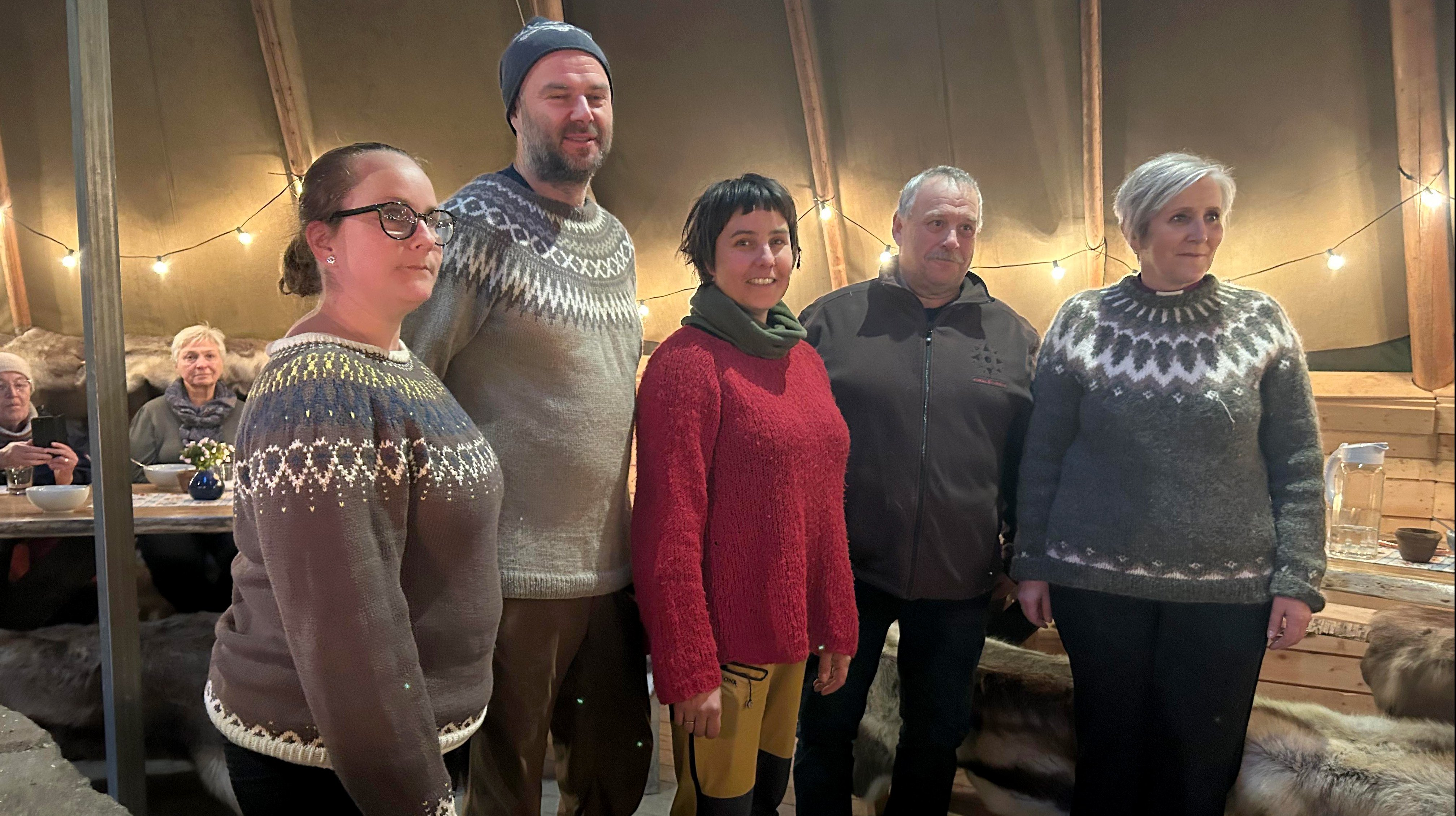 Deltagere på kulturkvelden i lavvoen pa Namdalseid. Fra venstre: Elise Holtan Pavall Årbogen, Steinar Holtan Furre, Sissel Holtan Furre, Terje Haugan og biskop Herborg Finnset. (Foto: Tina Møllersdatter Solbakken)