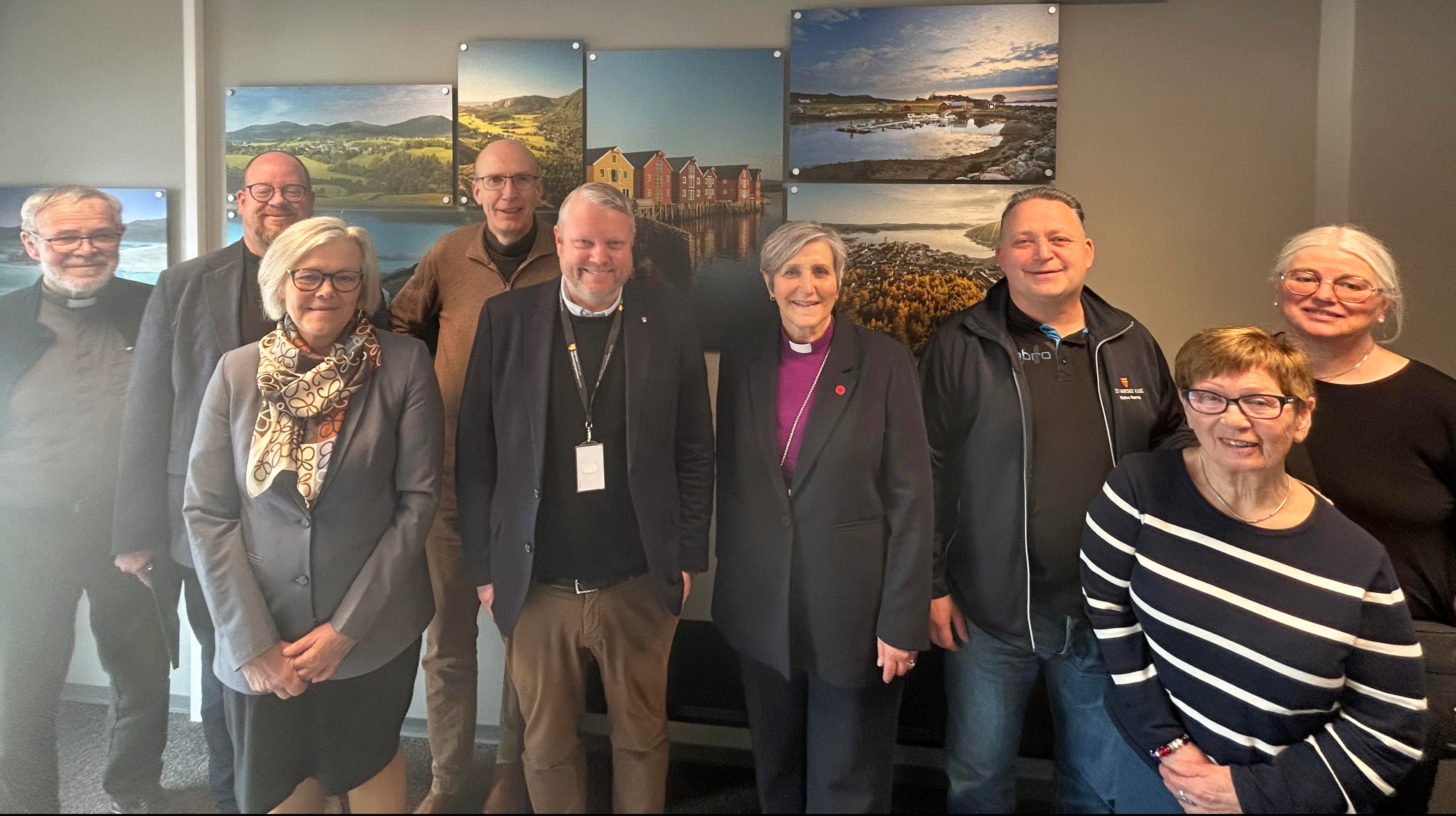 Deltagere på møtet mellom biskop og ordfører i Namsos. Fra venstre: Sokneprest Gustav Danielsen, prost Sven Becker, fungerende kommunedirektør SRønnaug Aaring, kirkeverge Magne Bergslid, ordfører Amund Lein, biskop Herborg Finnset, fellesrådsleder Tore Strøm, menighetsrådsleder i Namdalseid Solfrid Skevik og menighetsrådsleder i Statland Janne Katrine Ekker Myren. (Foto: Tina Møllersdatter Solbakken)