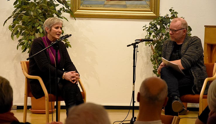 Biskop Herborg Finnset i samtale med ansvarlig redaktør i avisa Innherred, Roger Rein.