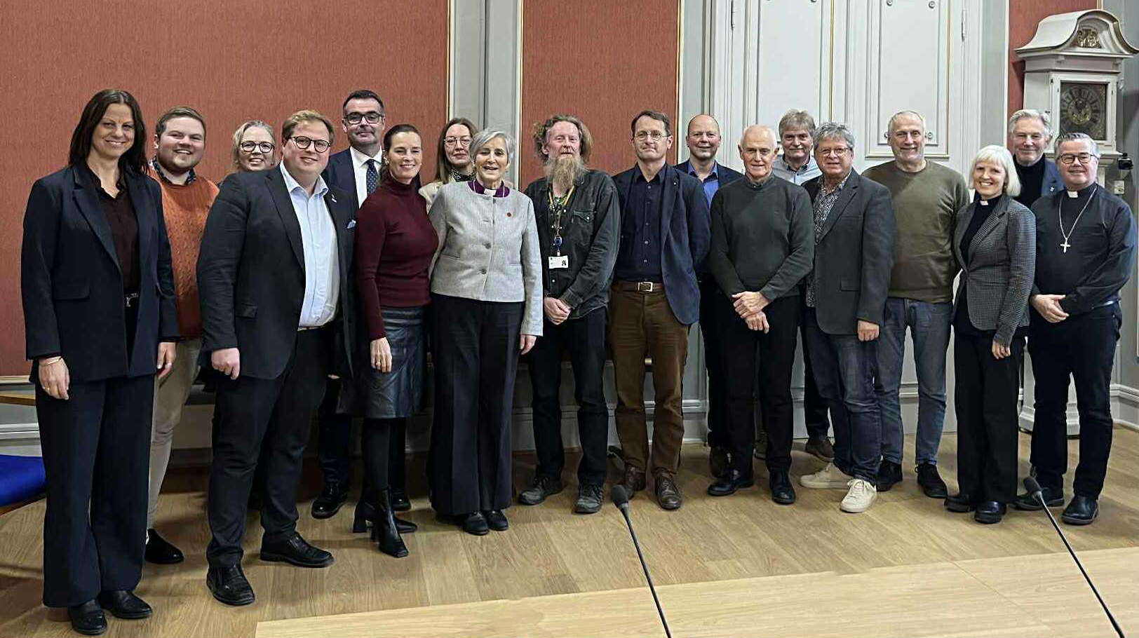 Fra møtet medllom biskopen og hennes følge og heltidspolitikerne i Trondheim kommune. Fra venstre: kirkefagsjef Aud Kristin Saltvik Aasen, Vegard Frøseth Fenes (Sp), Kirsti Tømmervold (Ap), Mats Ramo (H), ordfører Kent Ranum (H), Majen Helen Sævik (KrF), Silje Naper Salomonsen (SV), biskop Herborg Finnset, Roald Arentz (R), Trond Åm (V), byrådsleder Kjetil Reinskou (H), kirkeverge Kjell Inge Nordgård, Lars Erling Lossius, Odd Anders With, sokneprest Per Even Robertstad, prost Bodil Slørdal, varaordfører Erling Moe og sokneprest Dagfinn Bjerkestrand.