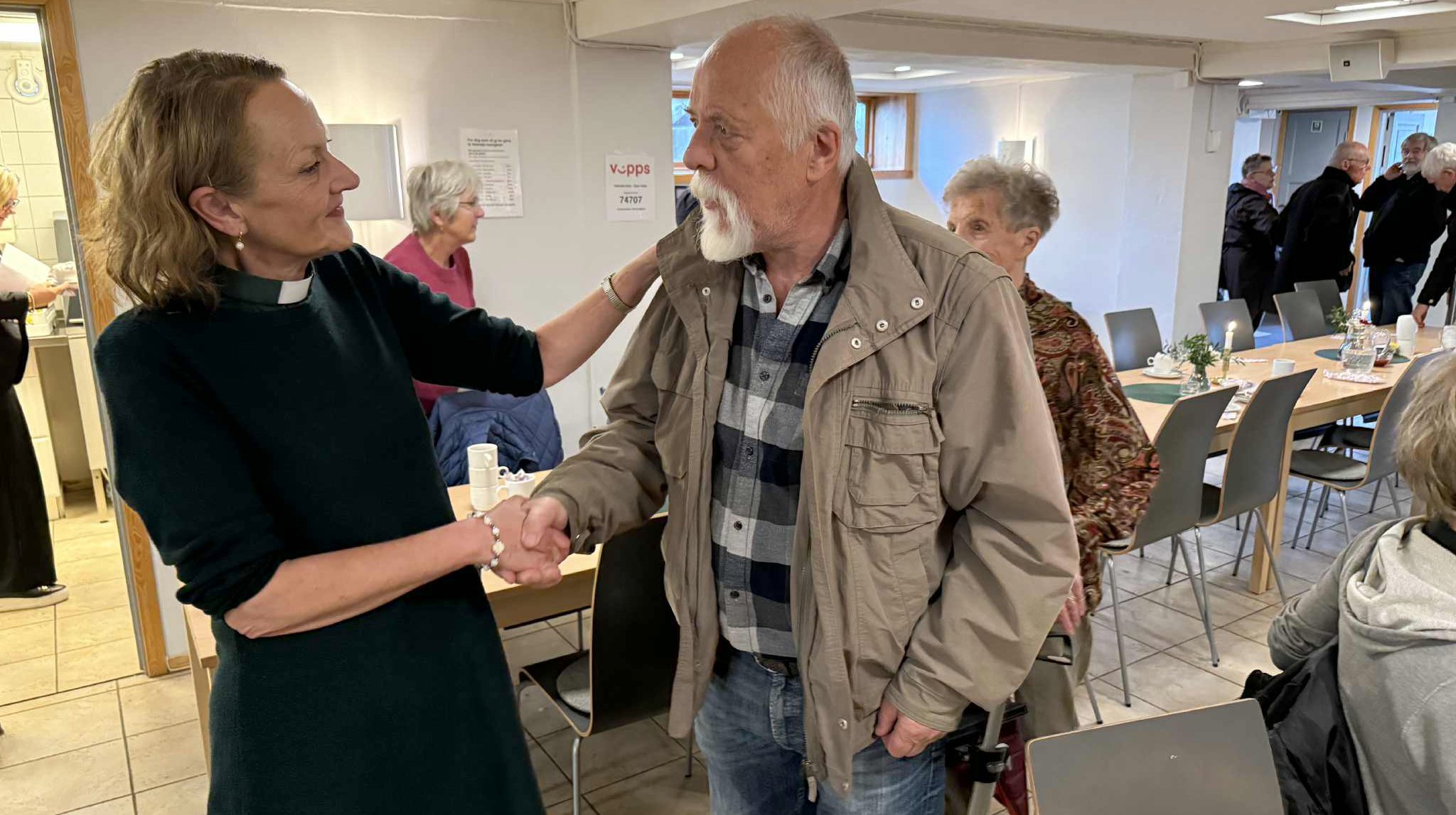 Hver tirsdag formiddag feires det hverdagsgudstjeneste i Heimdal kirke, og biskopen og hennes følge fikk være med. Etterhvert fyltes kirkekjelleren med lokale gjester. Biskop Herborg deltok sammen med språkforsker og trekkspillmusiker Tor Erik Jenstad, kjent fra «Dialektmagasinet» på NRK Trøndelag.