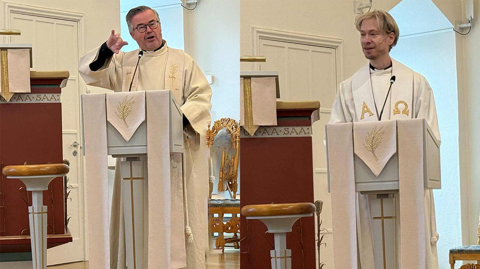 Sogneprest Dagfinn Bjerkestrand og kapellan Tord Thuen deltok begge i hverdagsgudstjenesten i Heimdal kirke under første dag av bispevisitasen. (Foto: Aud Krisitn Saltvik Aasen)