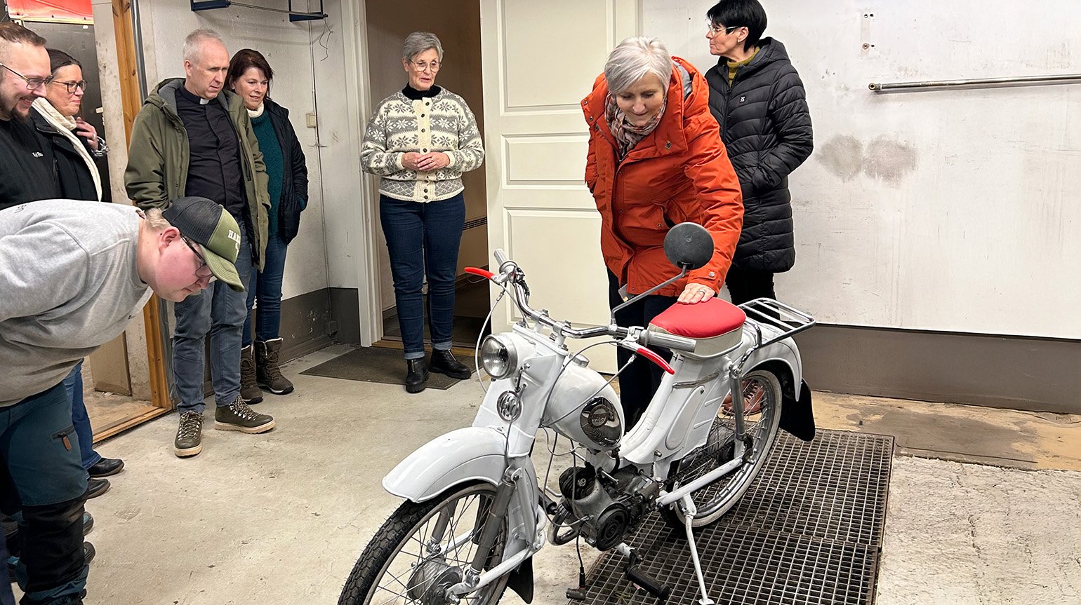 Biskop Herborg fikk inspisere veteransykler under oppussing i Malm Autoklubb
