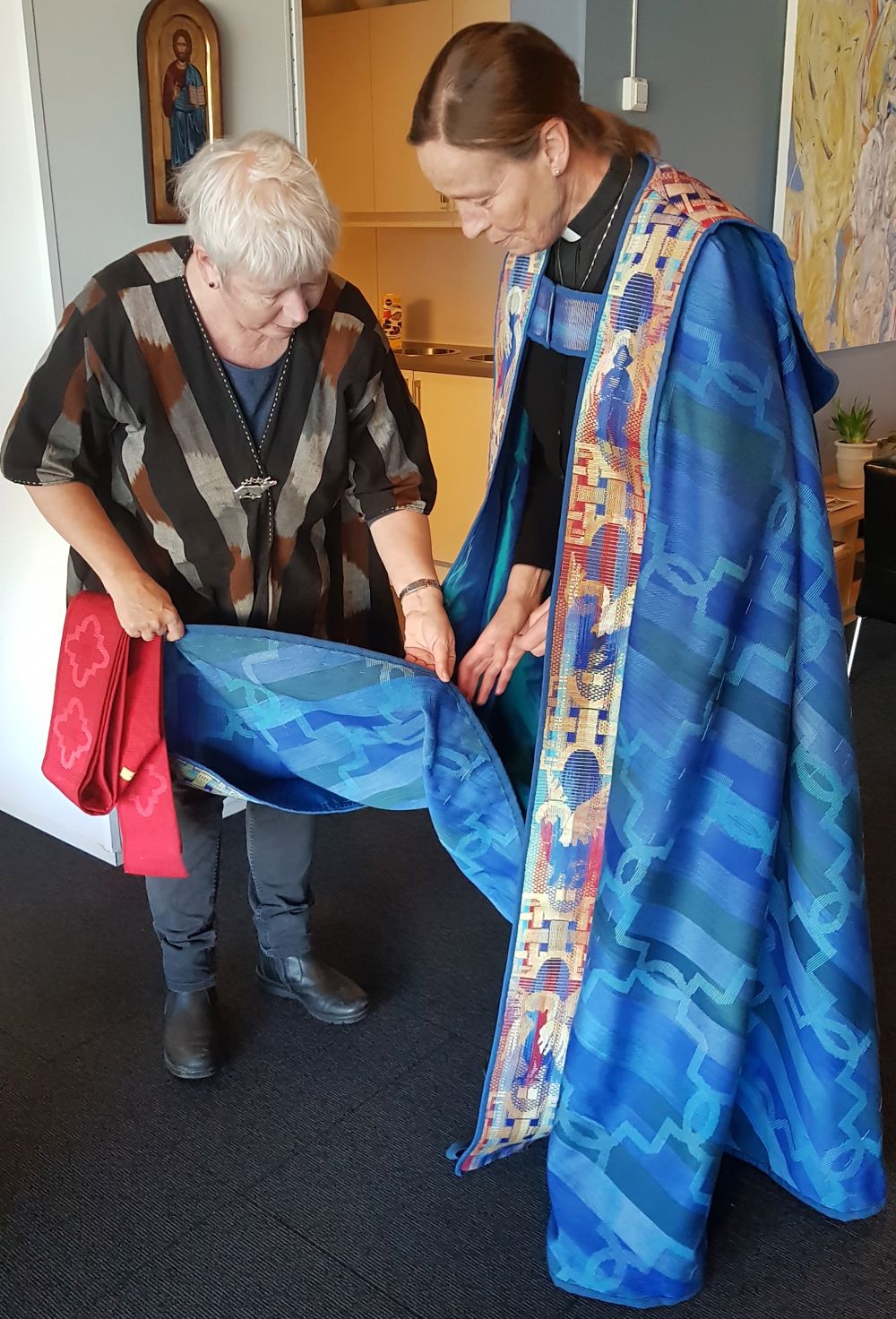 Derfor var gleden stor da kunstner Åse Eriksen ankom bispedømmekontoret i Stavanger forrige uke med en ny, vakker, og ikke minst solid bispekåpe.