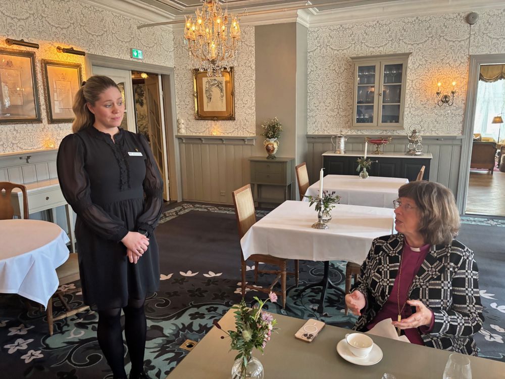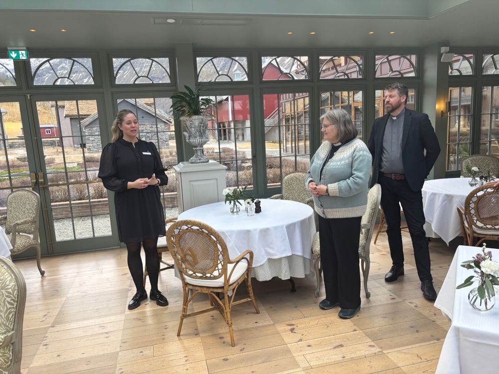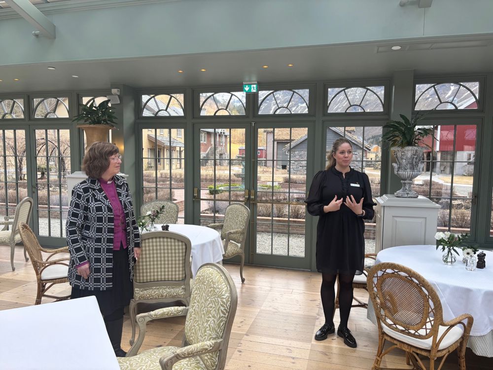 Frå Hjørundfjordheimen gjekk turen vidare over fjorden til Øye og Hotel Union. Her fekk følget servert ein nydeleg lunsj og ei flott omvising ved direktør Mariann Øye. Hotellet har kvart år ønske om vigsel og bryllup og også kyrkja har hatt fleire vigsle der dei siste åra. Dette var eit godt høve for å samtale om dette gode og viktige samarbeidet.