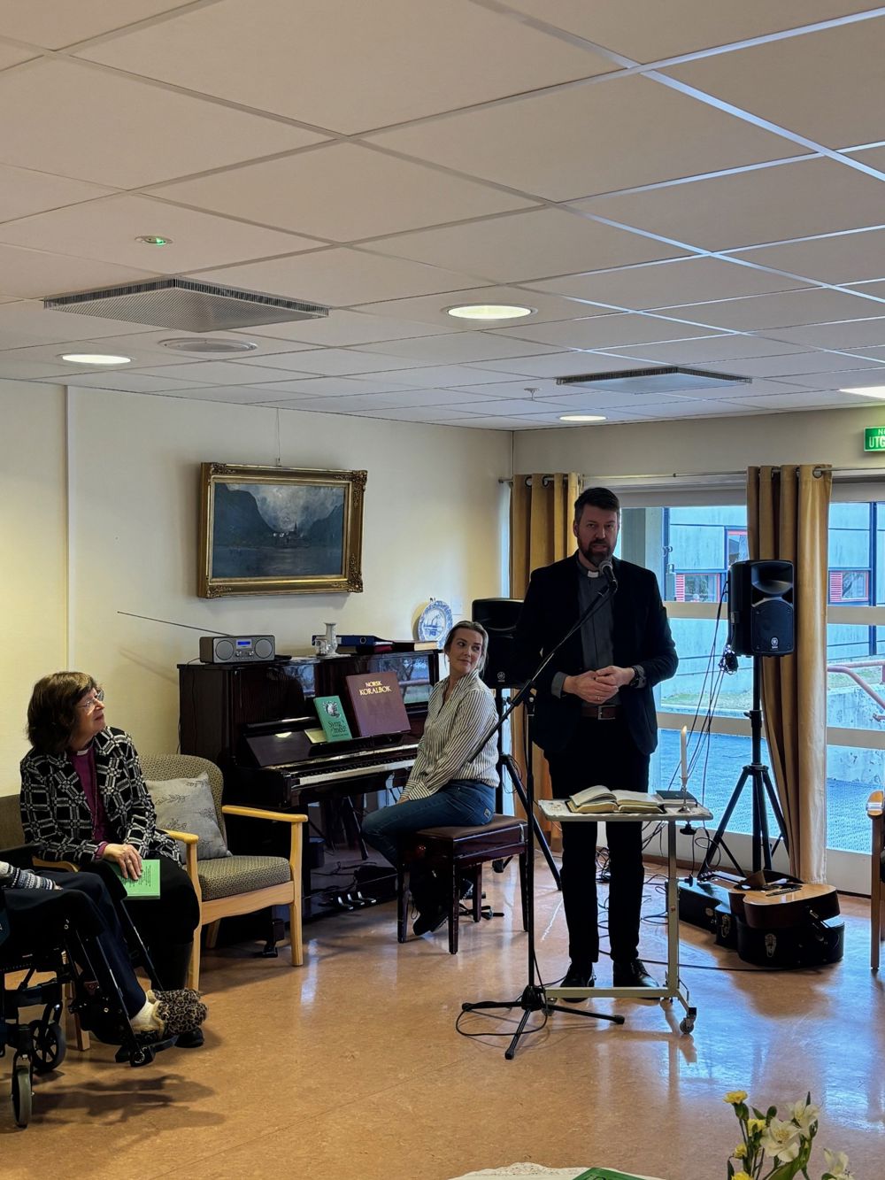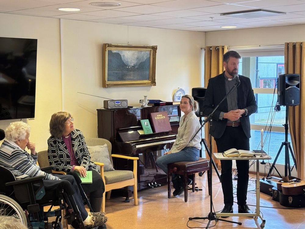 På Hjørundfjordheimen hadde sokneprest Espen Aarseth andakt, medan biskopen helsa og lyste velsinginga. Etter andakten var det god tid til prat og gode historier.