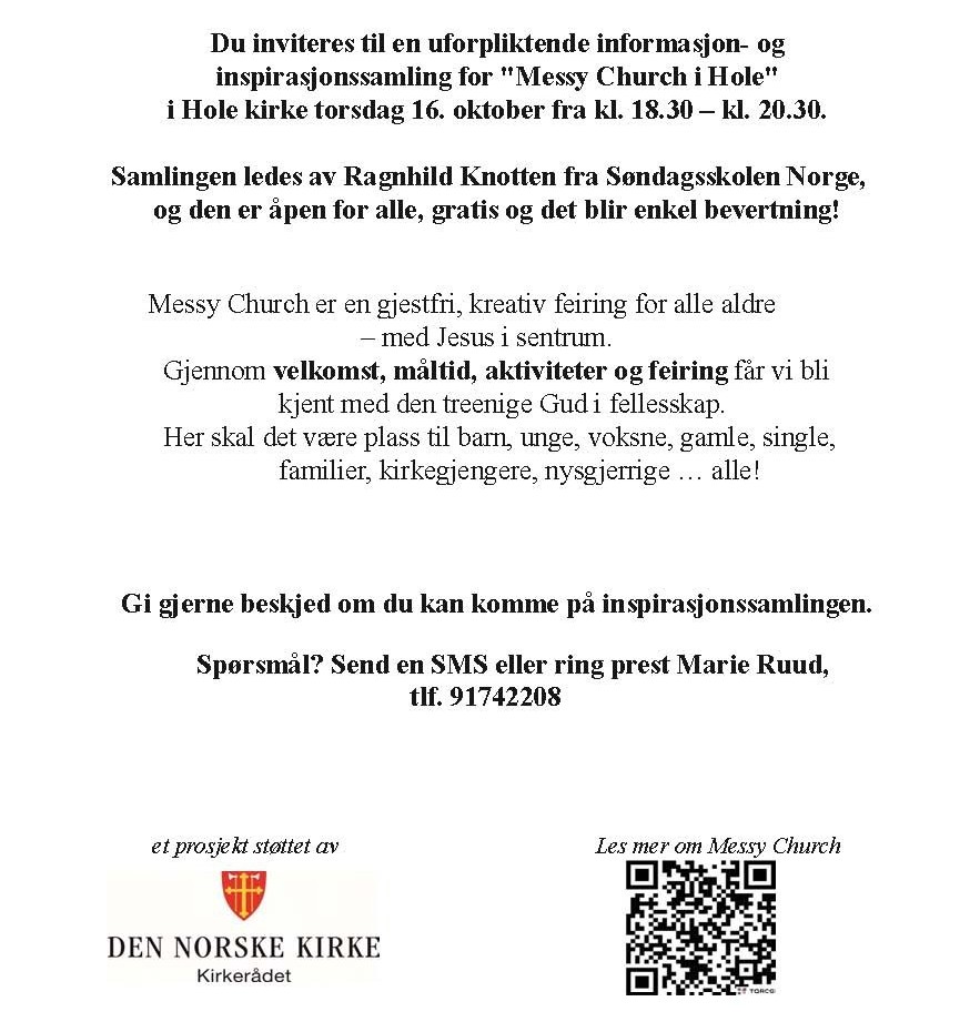 Velkommen til en uforpliktende informasjon- og inspirasjonssamling for Messy Church i Hole kirke torsdag 16. oktober fra kl. 18.30 til kl. 20.30!