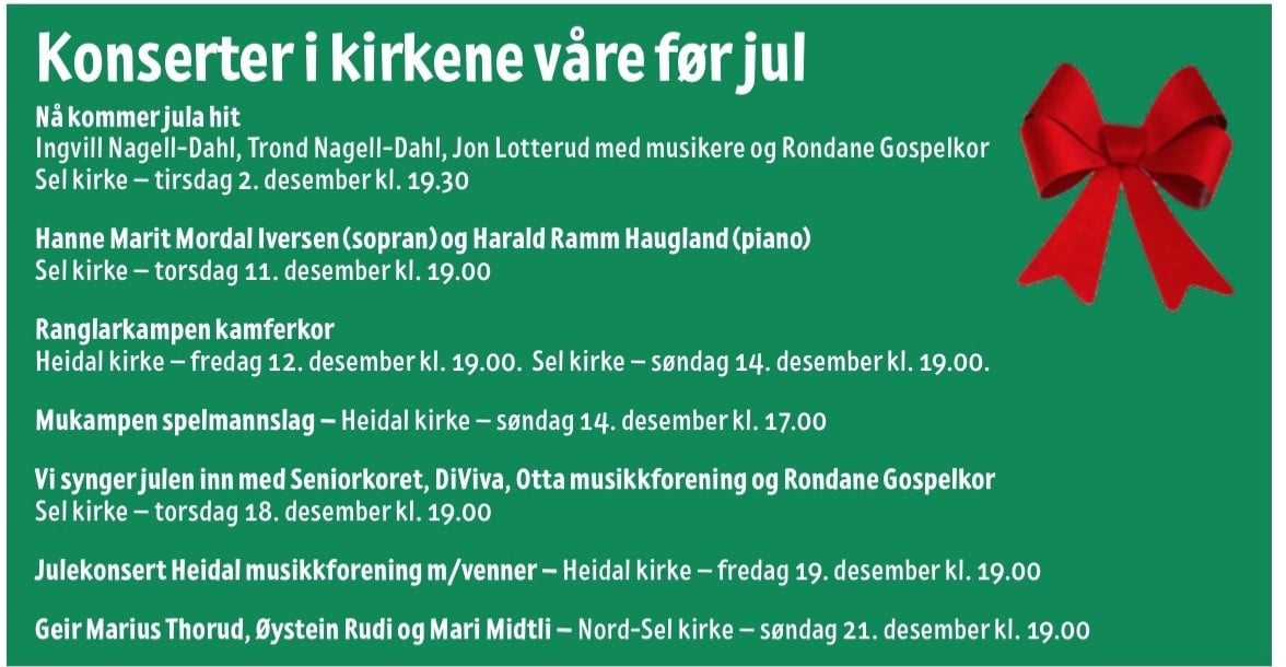 Førjulstida er tida for konserter, og du inviteres til trivelige konserter med kor, korps og ulike artister i kirkene våre før jul! Hjertelig velkommen!