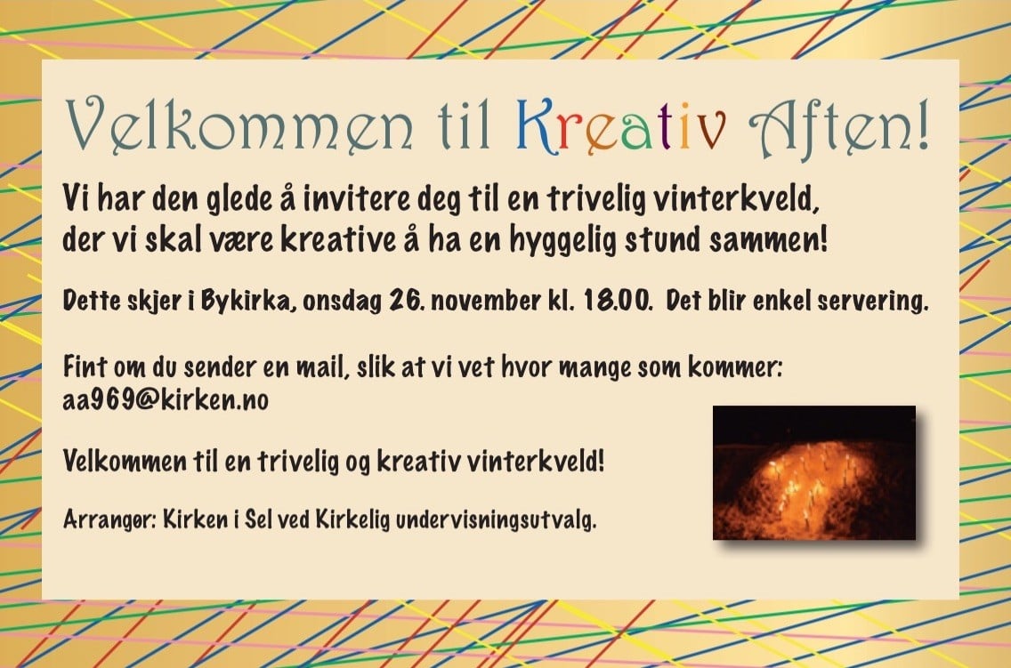 Vi har den glede å invitere deg til en Kreativ Aften i Bykirka på Otta 26. november kl. 18.00. Ta med deg gode ideèr, vi skaffer utstyr og ordner med servering. Åpent for alle! Hjertelig velkommen!