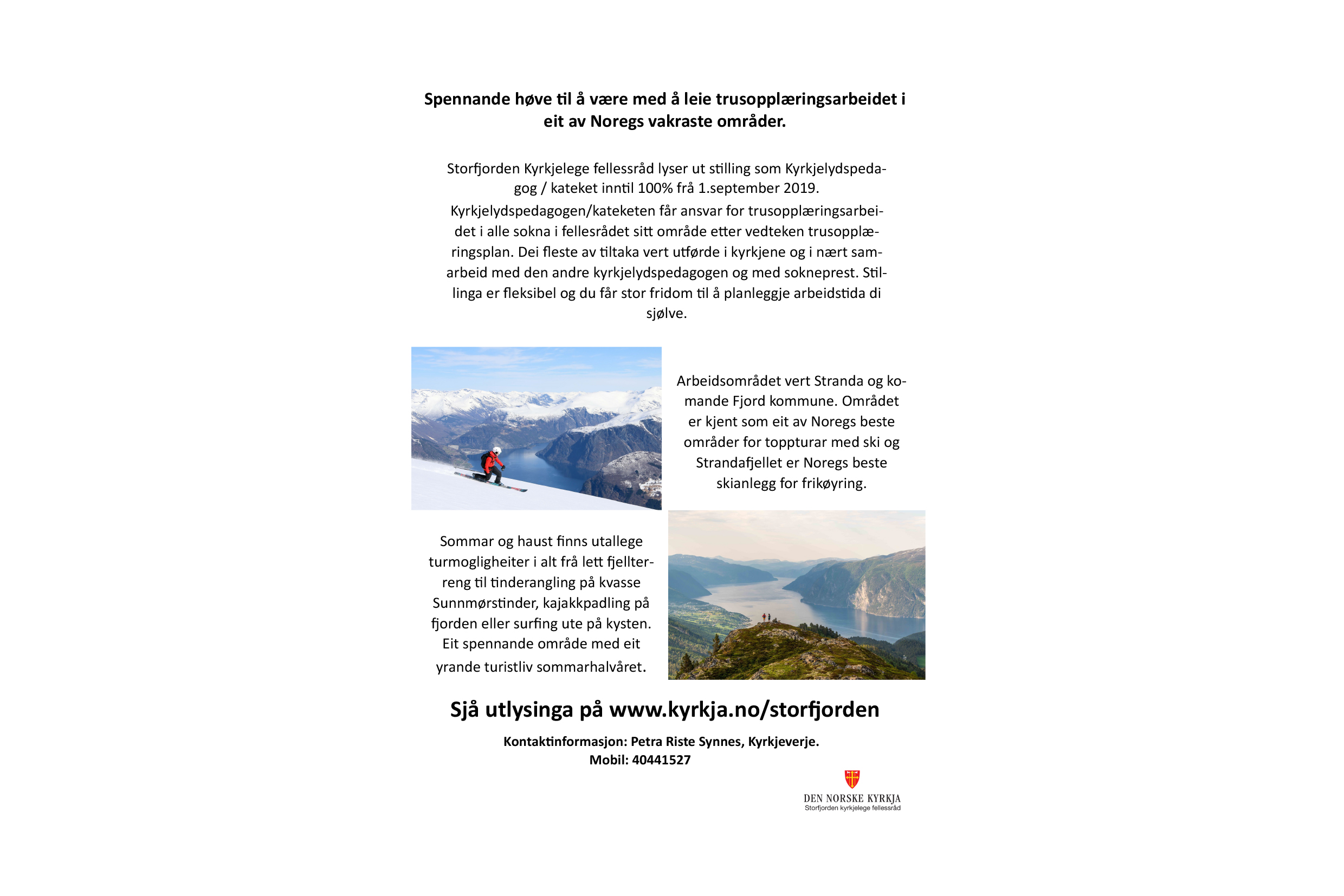 Ledig stilling: Kyrkjelydspedag / kateket inntil 100% frå 1.september 2019.