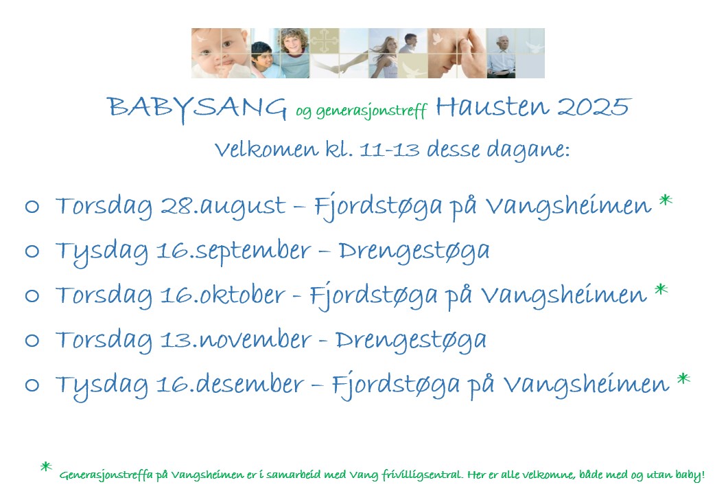 20.8.2025Velkommen til babysong på Drengestøga og generasjonstreff med babysong på Vangsheimen i haust.