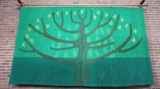 Kirketekstilene på veggen veksler med kirkeåret. De er vevet av Askerkunstneren Molle Cecilie Major.