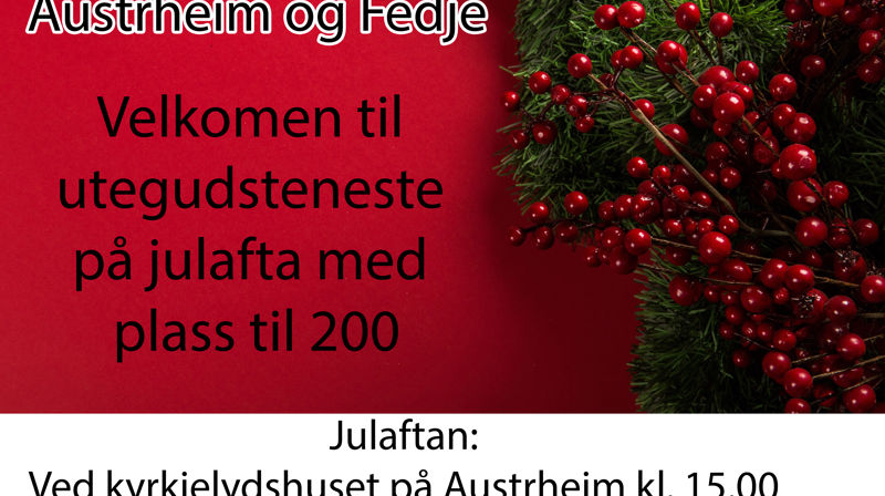 På julafta blir det på skuleplassen utanfor kyrkjelydshuset. Parkering ved kyrkja. Ta gjerne med deg ein stol om du vil sitje. Etterpå går me i fakkeltog bort til kyrkja der me ringer med kyrkjeklokkene og syng Deilig er jorden