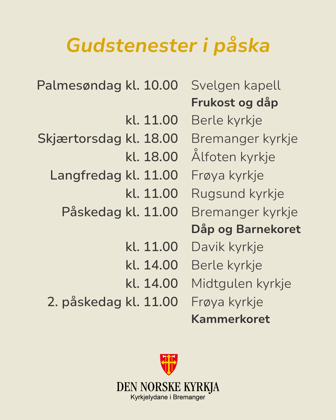 Oversikt over alle gudstenester i kyrkjene i Bremanger i påska.