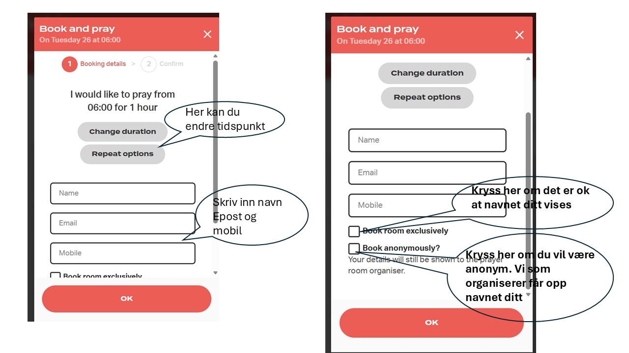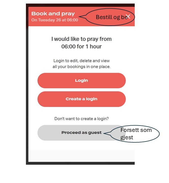 Når du trykker påmeldingslinken får du opp en oversikt over alle timene i døgnet. Om du klikker på den timen du vil be får du opp dette bilde: