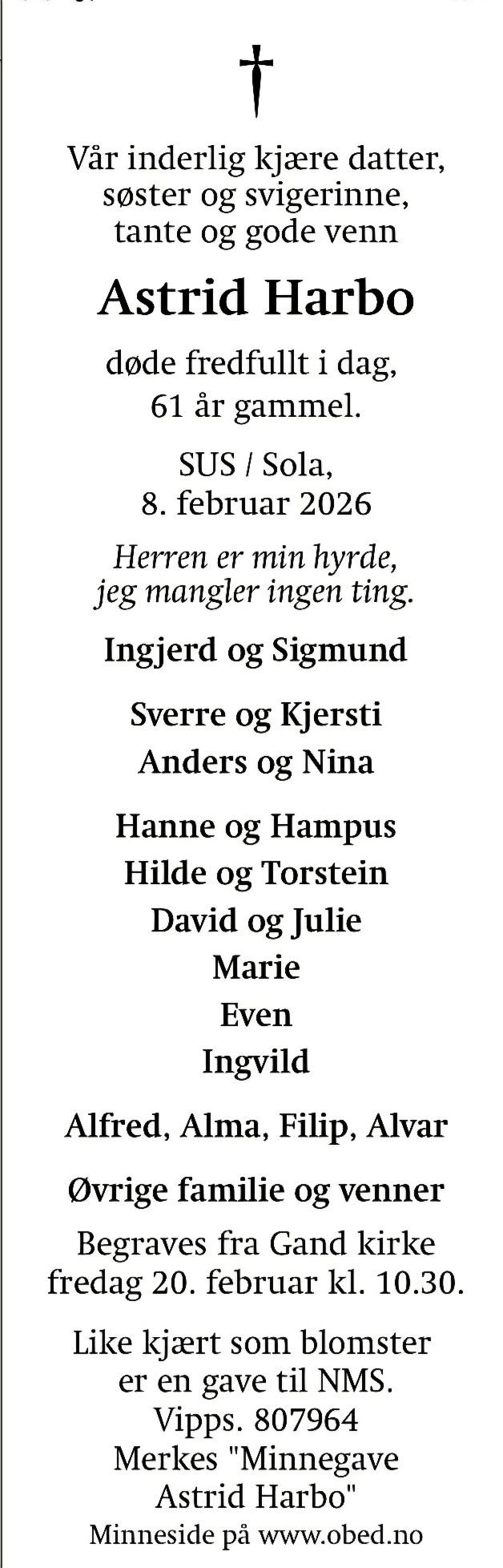 Begravelsen blir fra Gand kirke, 20. februar 2026, kl. 10.30.