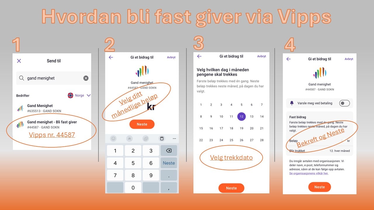 - Du kan også bli fast giver via Vipps! Da vippser du til 44587 og setter opp fast månedlig trekk derfra. Dette gir også skattefradrag.