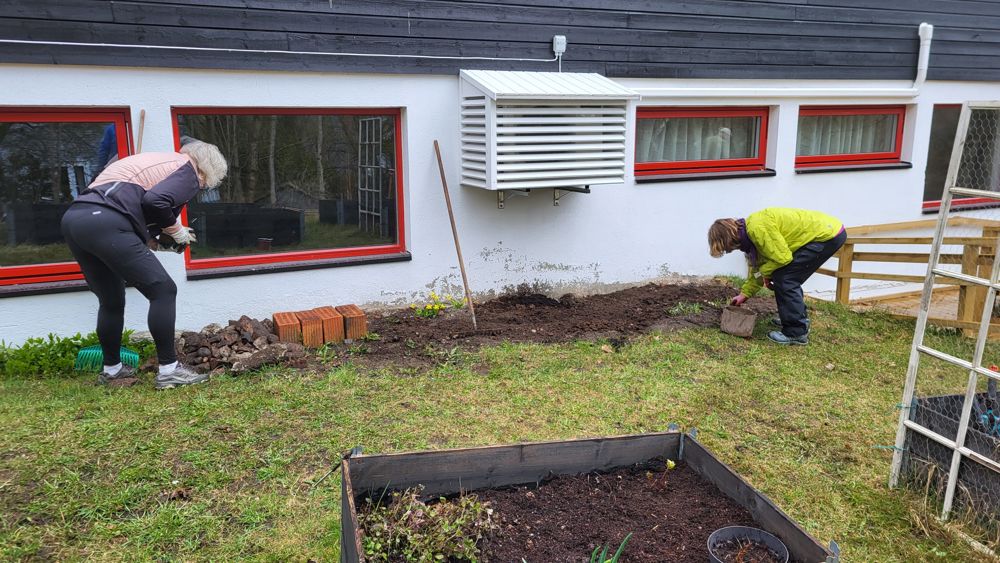 Vi vil gjerne ha med flere til å jobbe. Det er VELDIG sosialt og hyggelig - og morsomt. Hver tirsdag utover sommeren møtes vi for å spise lunsj, vanne og ordne i hagen.