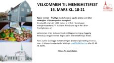 24.2.2022Sett av kvelden den 16.mars kl. 18-21. Da møtes vi til fest i Storstua på Menighetssenteret!