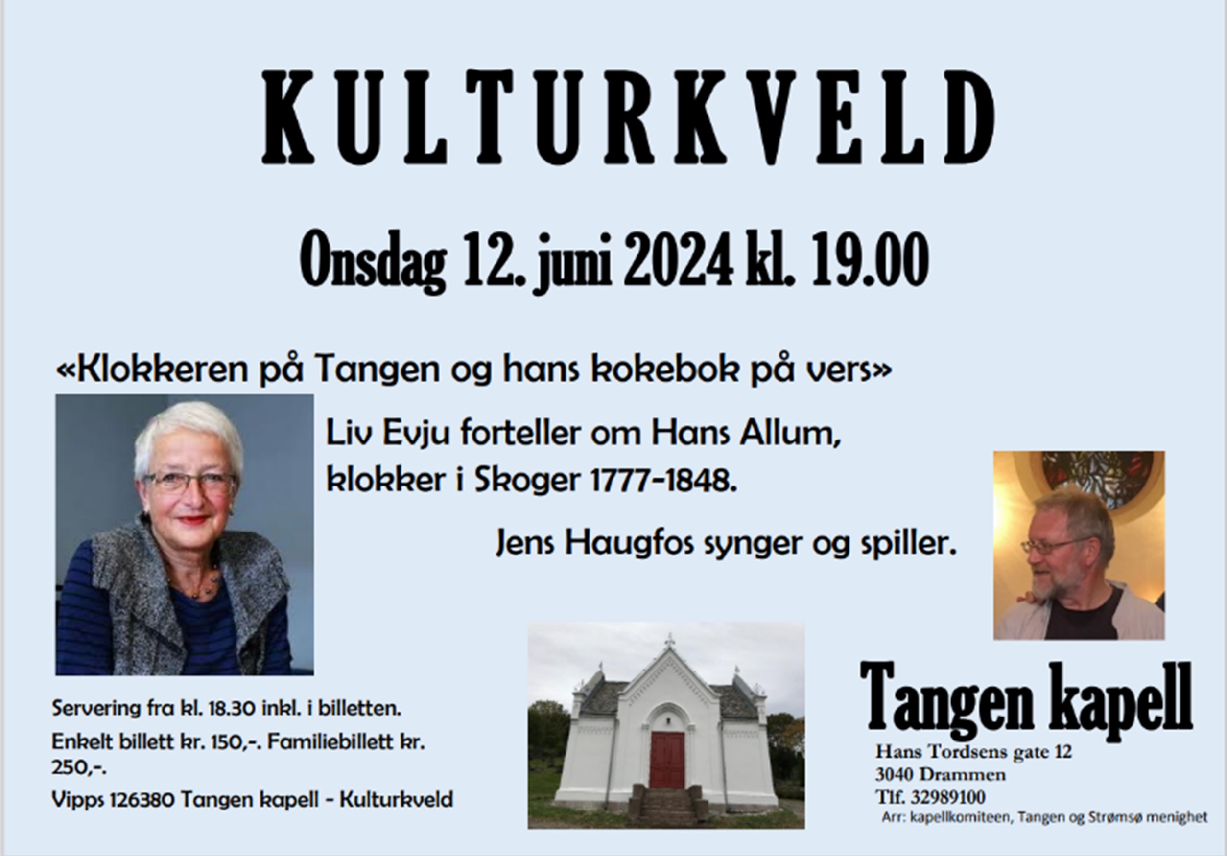 Kulturkveld i Tangen kapell onsdag 4. september kl. 19.00