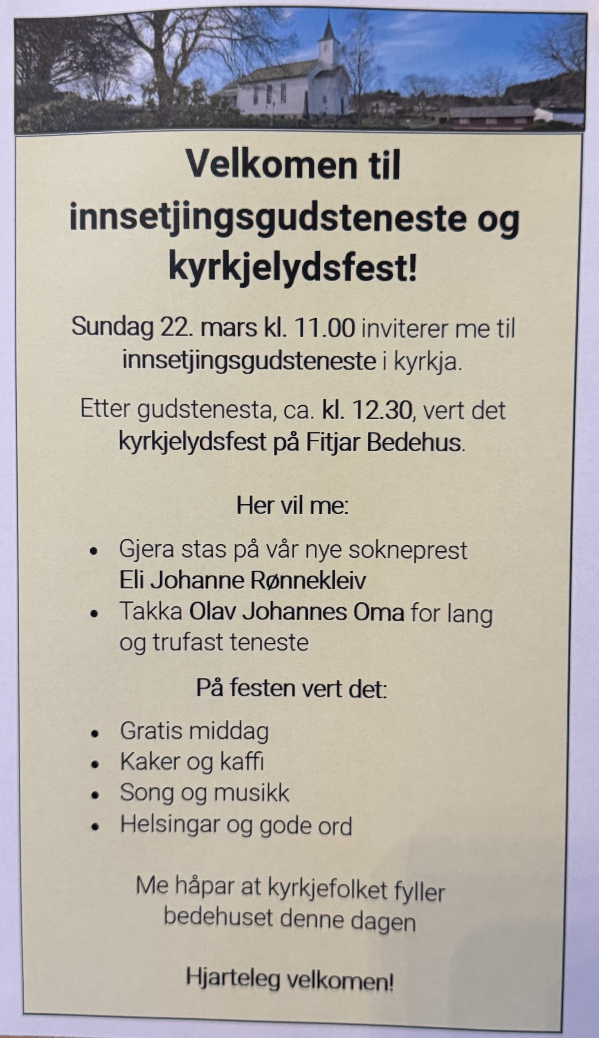 Velkomen til gudsteneste i Fitjar kyrkje - søndag 22. mars kl.11.00