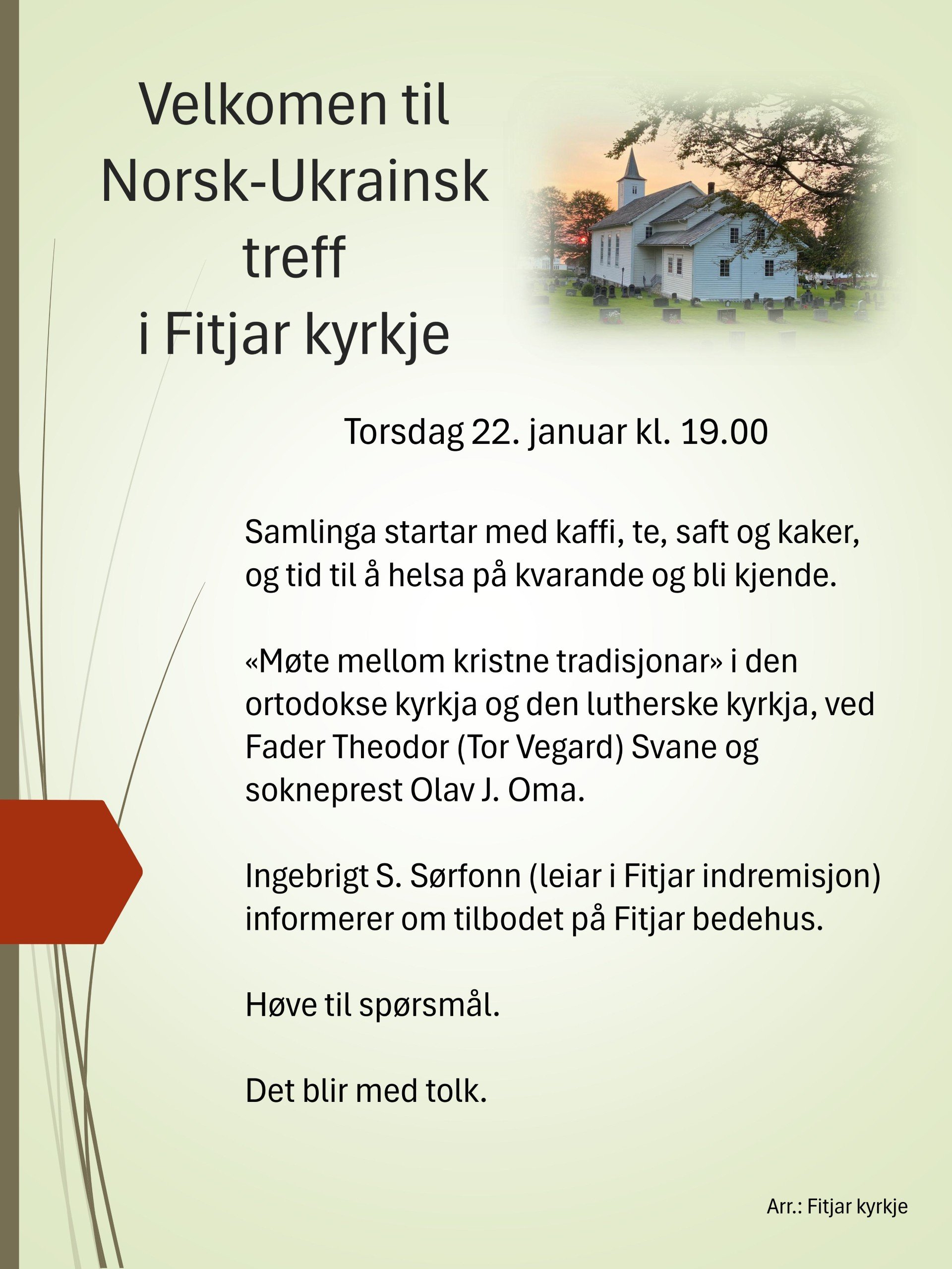 Torsdag 22. januar kl.19.00 vert det Norsk - Ukrainsk samling i Fitjar kyrkje.