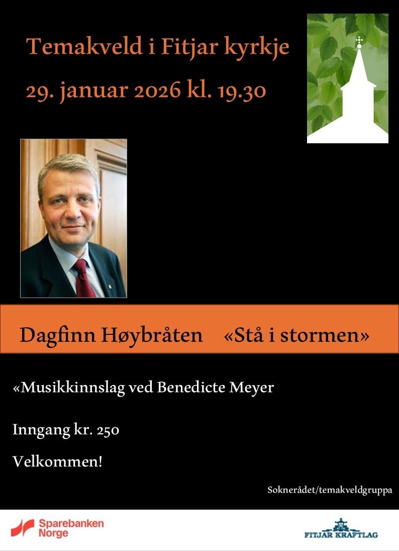 Det vert temakveld i Fitjar kyrkje torsdag 29. januar kl. 19.30. Dagfinn Høybråten - "Stå i stormen". Inngang kr. 250,-. Arr. Temakveldgruppa.
