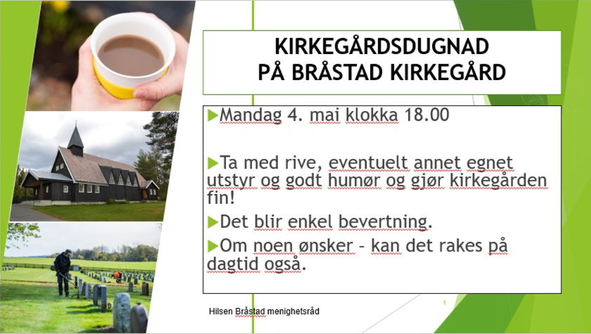 Velkommen til vårdugnad på Bråstad kirkegård, mandag 04. mai kl 18.00🌸