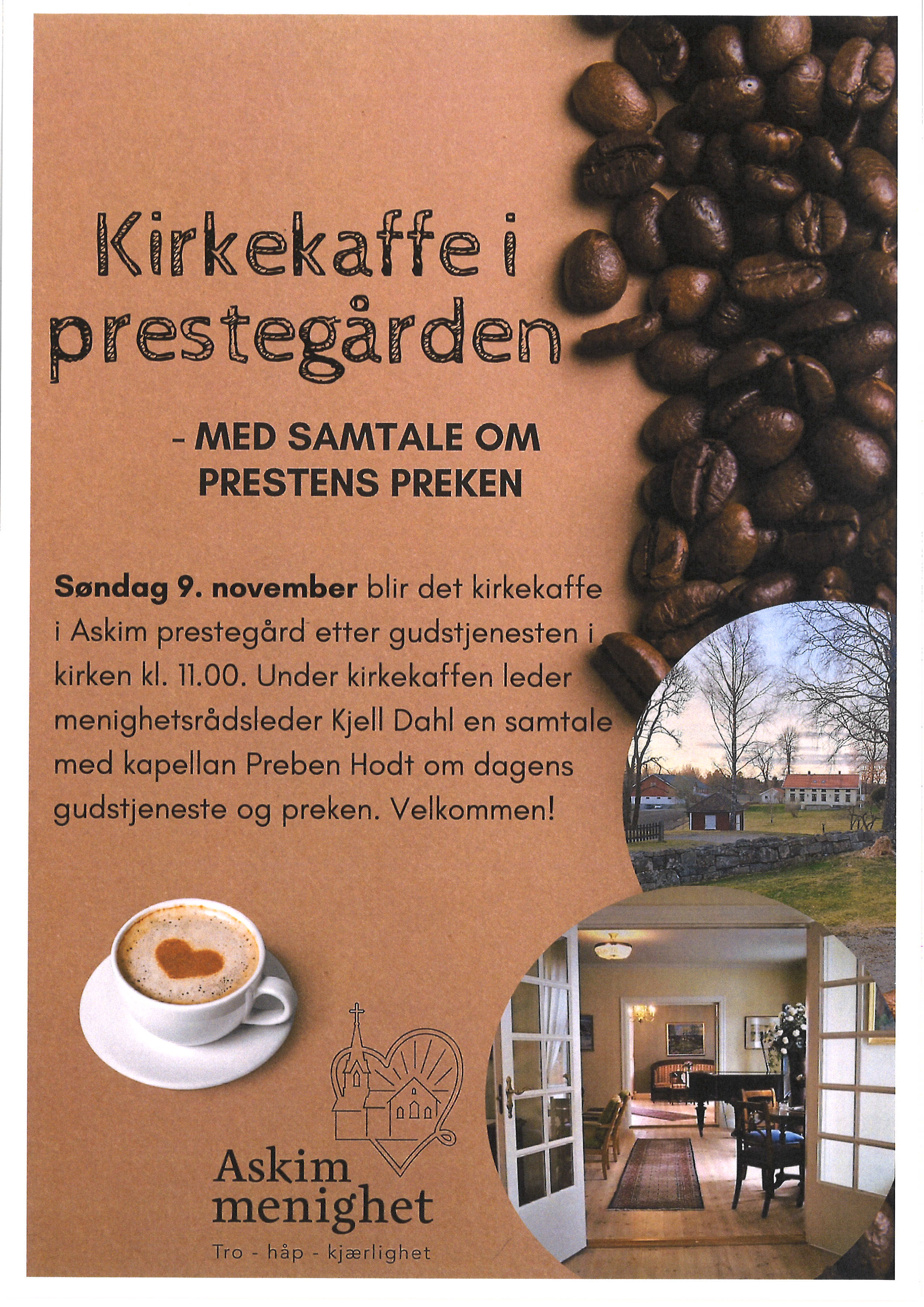 Søndag 9. november blir det kirkekaffe i Askim prestegård etter gudstjenesten kl. 11.00