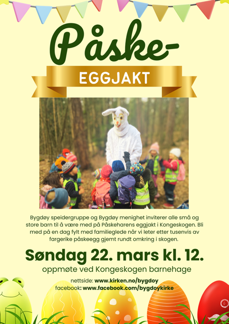 Bygdøy speeidergruppe og Bygdøy menighet inviterer alle små og store barn til påskeharens eggjakt.