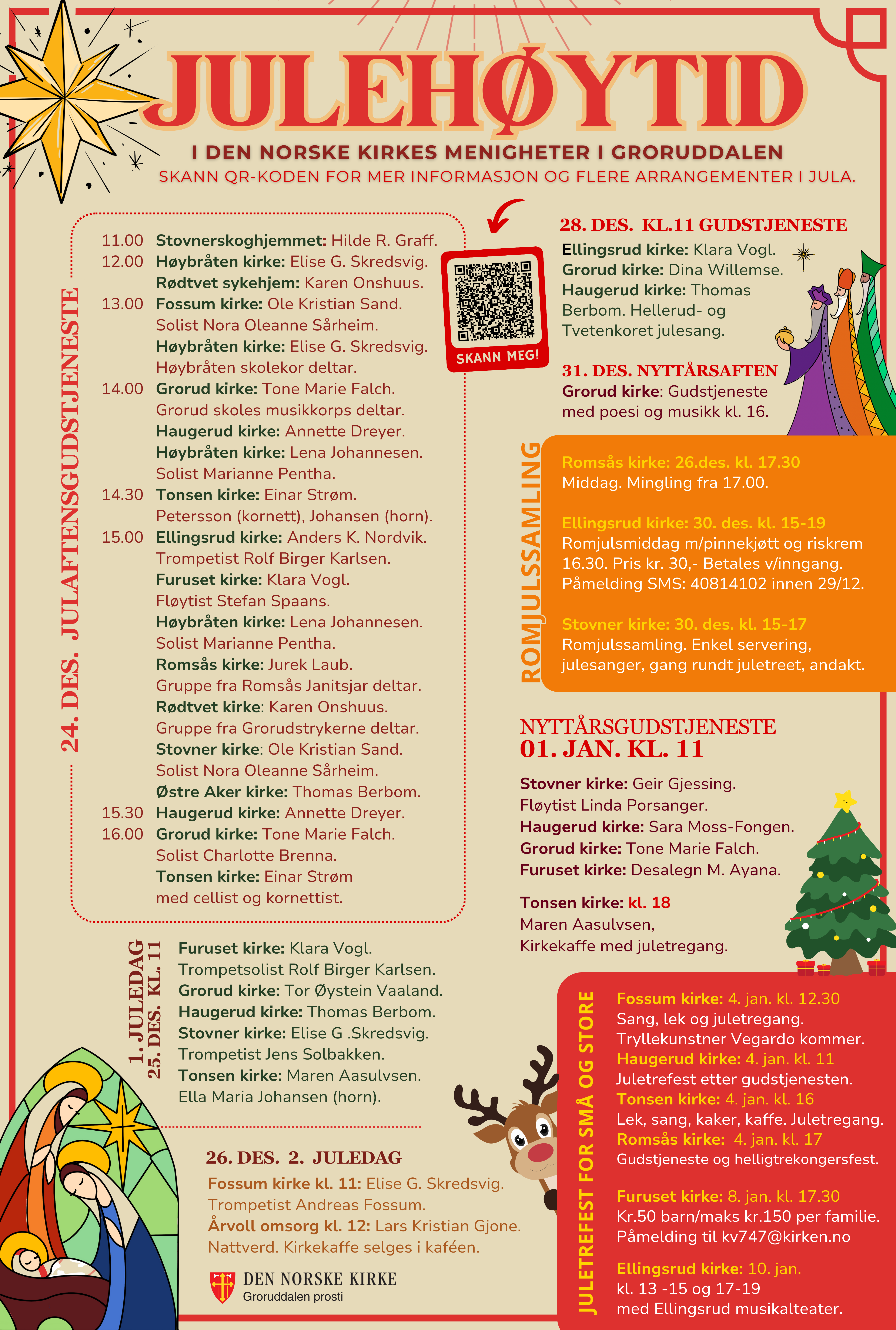 Grorud kirke kl. 11: Gudstjeneste med Nine Lessons and Carols. Prest Dina Willemse og organist Knut Kirkesæther. Solist: Helge Rønning. Kart