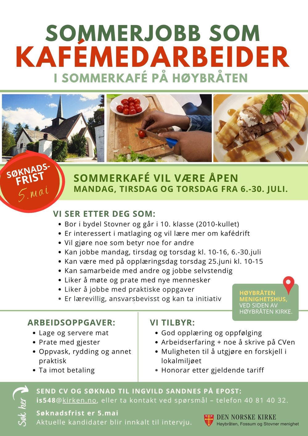 Høybråten, Fossum og Stovner menighet søker sommerjobb som kafémedarbeider i sommerkafé på Høybråten menighetshus, ved siden av Høybråten kirke.