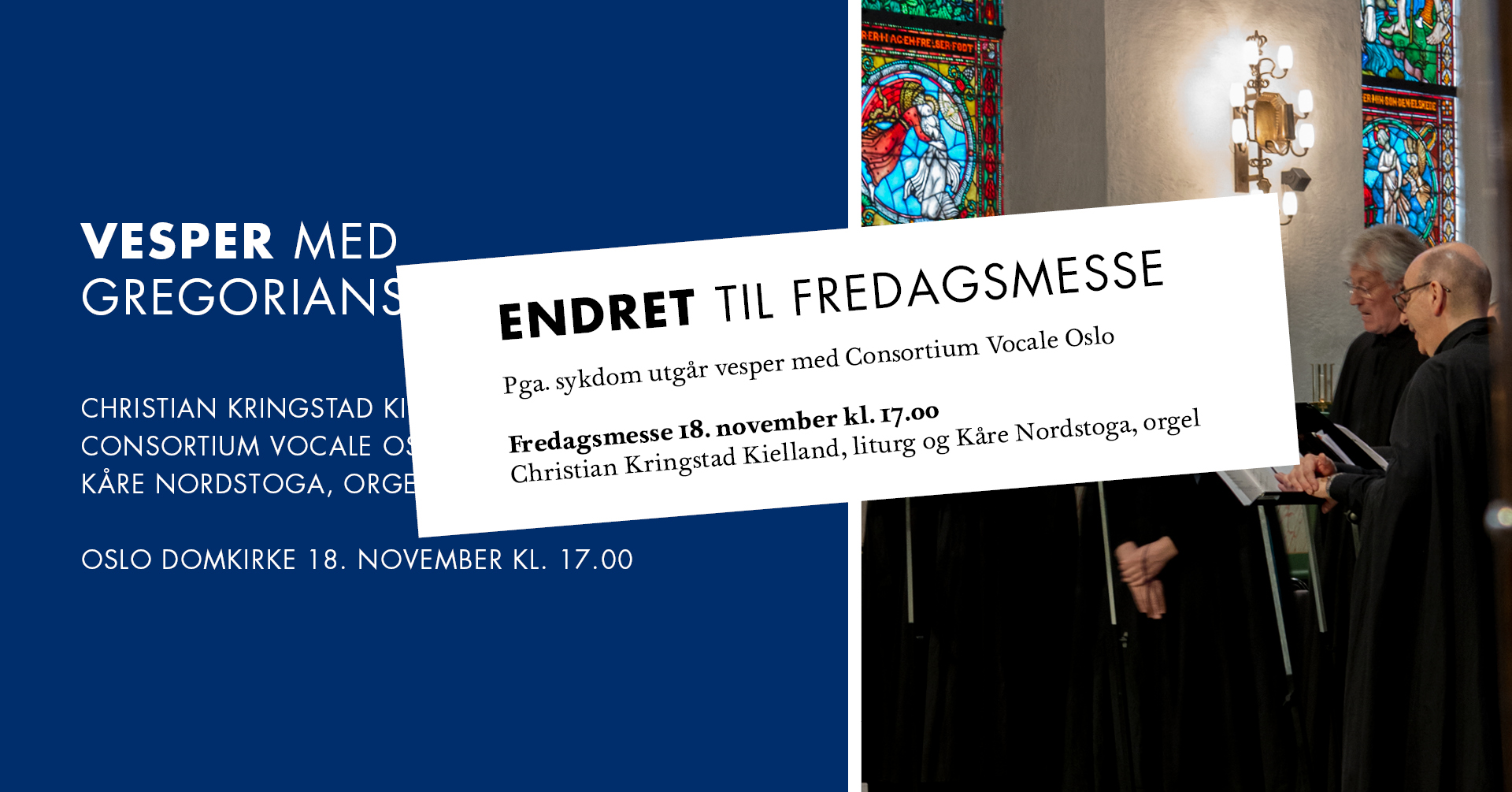 14.11.2022Pga. sykdom utgår vesper med Consortium Vocale Oslo, men det blir fredagsmesse som vanlig kl. 17.00