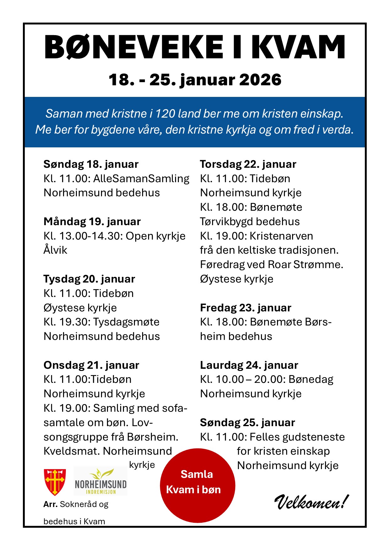 Samla Kvam i bøn med start søndag 18. januar. Du finn program ved å klikka på "Les meir"