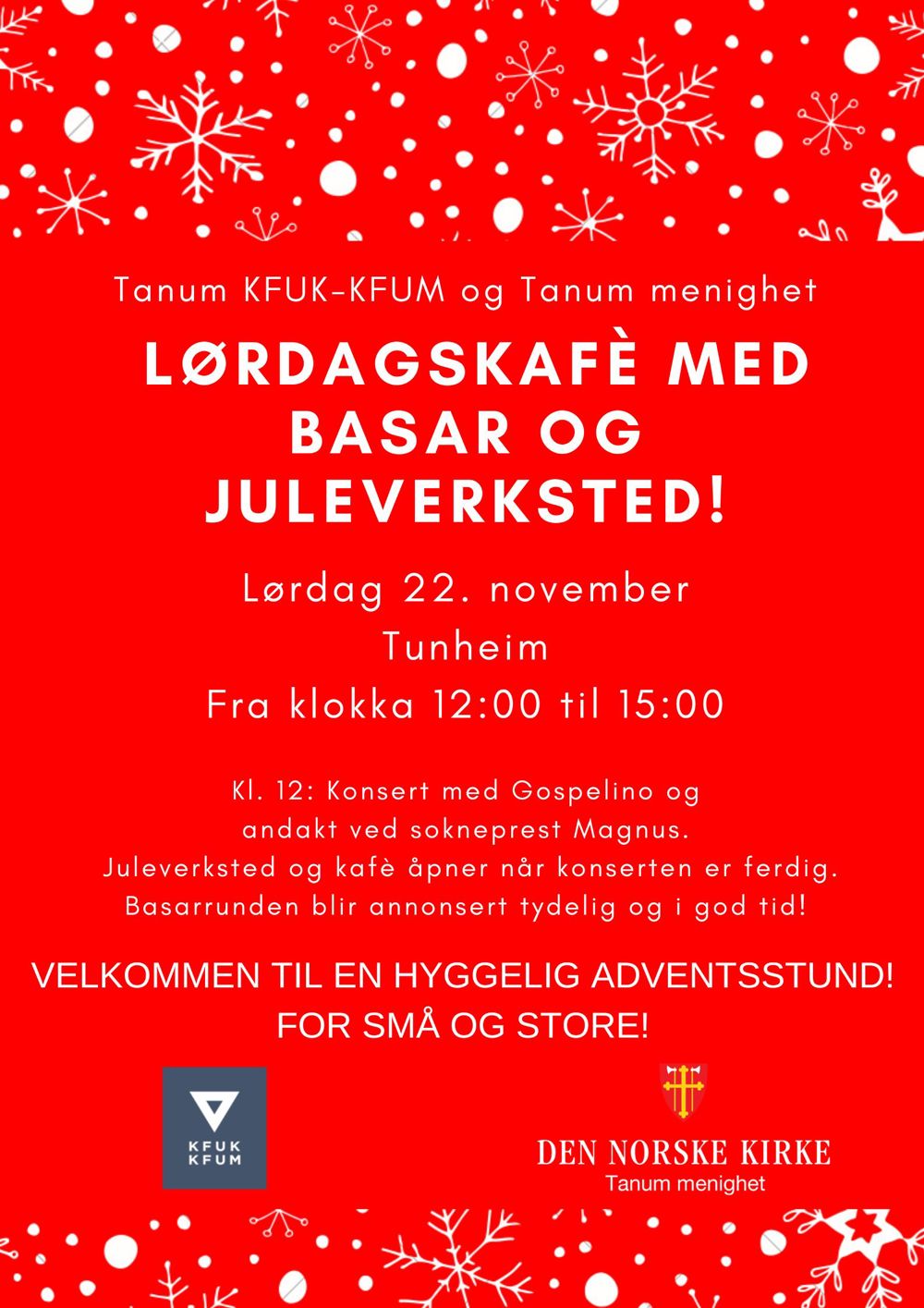 Velkommen til Tanum KFUK-KFUM og Tanum menighets årlige lørdagskafé med basar og juleverksted på Tunheim lørdag 22. november.