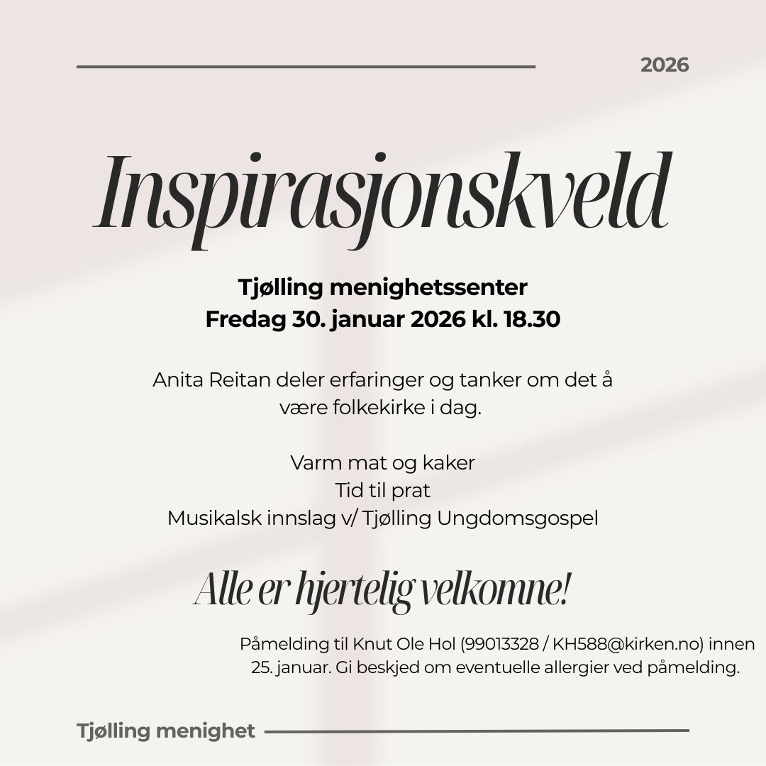 17.1.2025Velkommen til inspirasjonskveld på Tjølling menighetssenter 31. januar kl. 18:30.