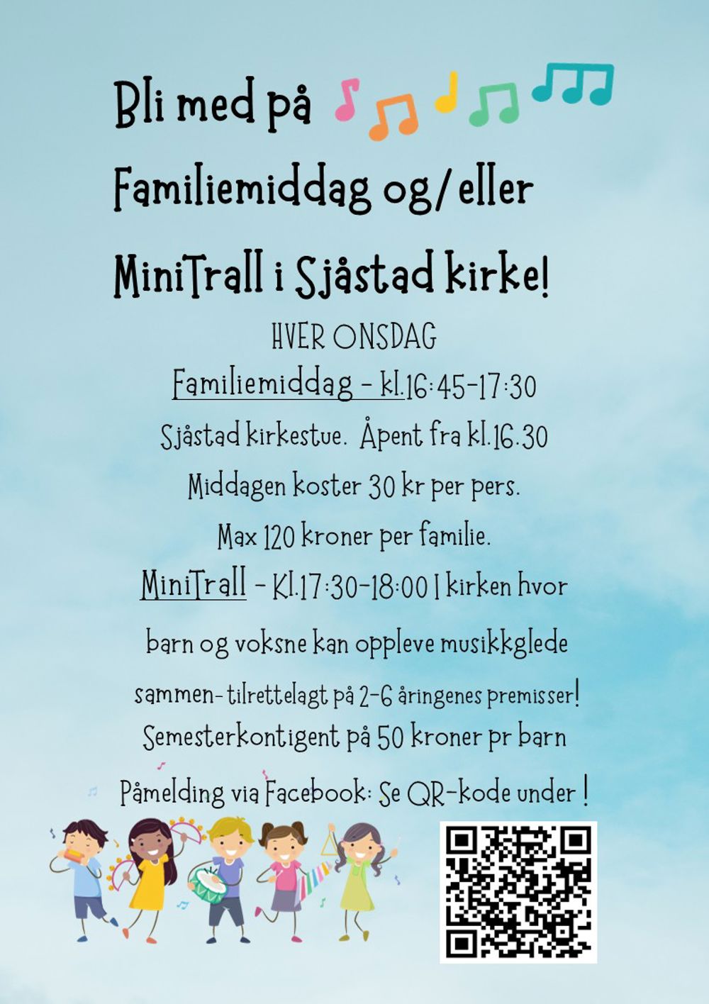 Det er semesterkontigent på 50 kr. Påmelding via Facebook ( se QR-kode ).