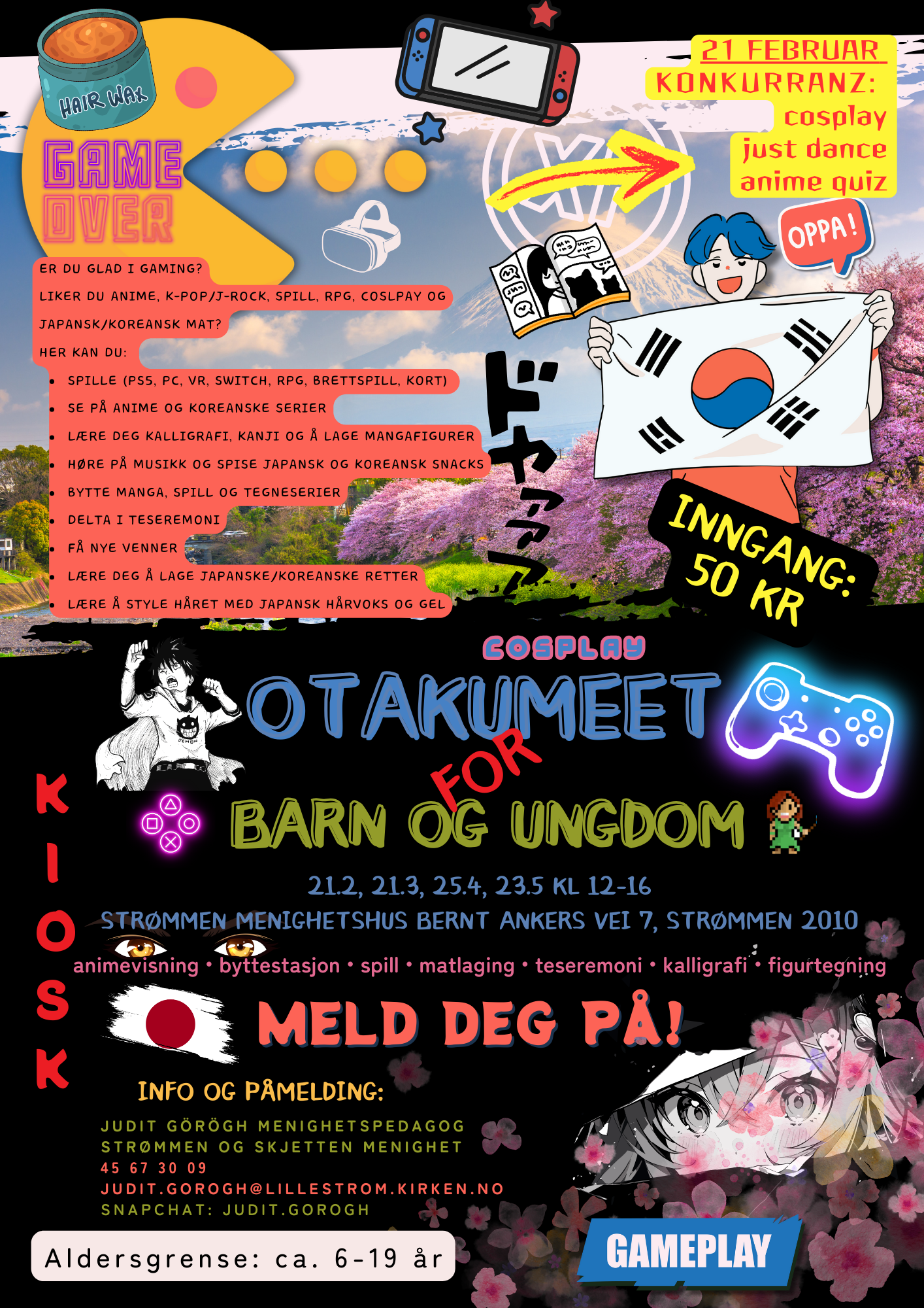 Er du mellom 6 og 19 år og liker anime, K-pop/J-rock, spill, RPG, Cosplay og japansk/koreansk mat? Da må du bli med på Otakumeet i Strømmen menighetshus.