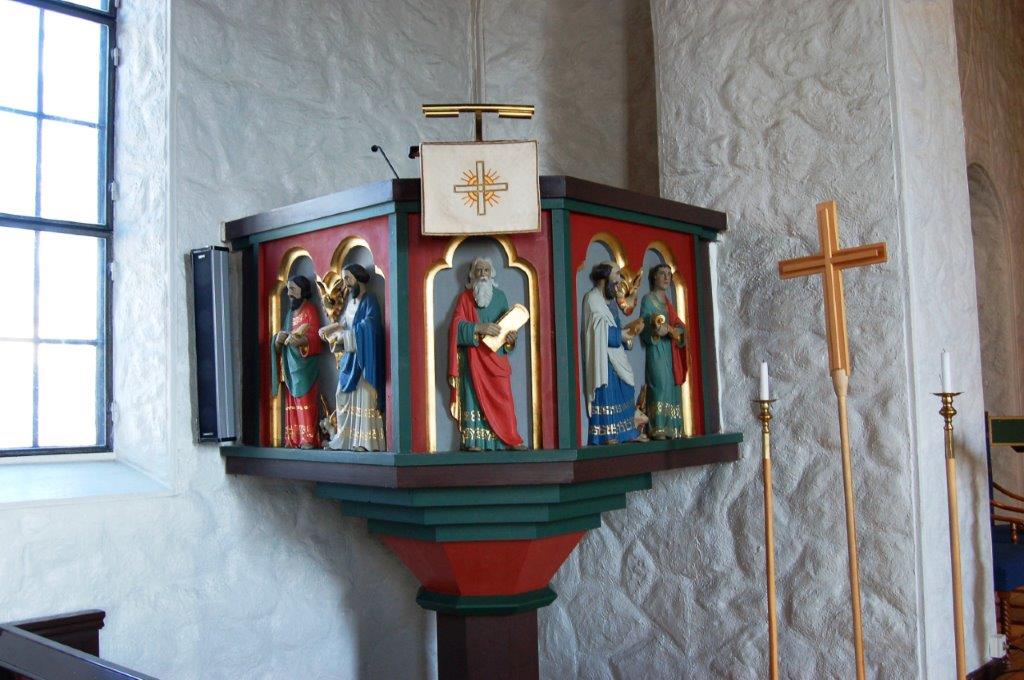 KirkerommetPrekestolen har tre fag med kløverbladbuer og figurer, fargesatt av Ellen Hernæs i 1957. I midten ser vi Moses med lovtavlene og på sidene evangelistene. |