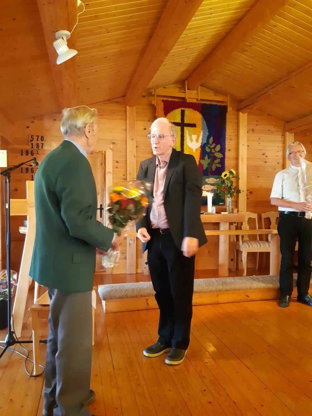 Leiar i Rådet for Søvasskjølen fjellkyrkje , Jan Arild Dahl, hedra leiar i byggekomiteen da Fjellkyrkja vart bygd i 1981: Tormod Hagen ved å kalle han fram og overrekke han ein blomsterbukett.