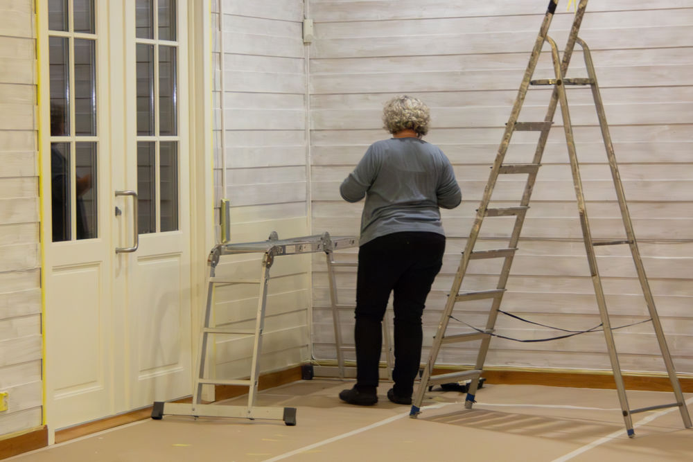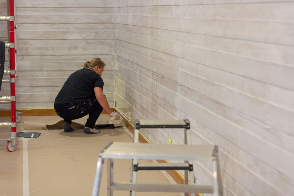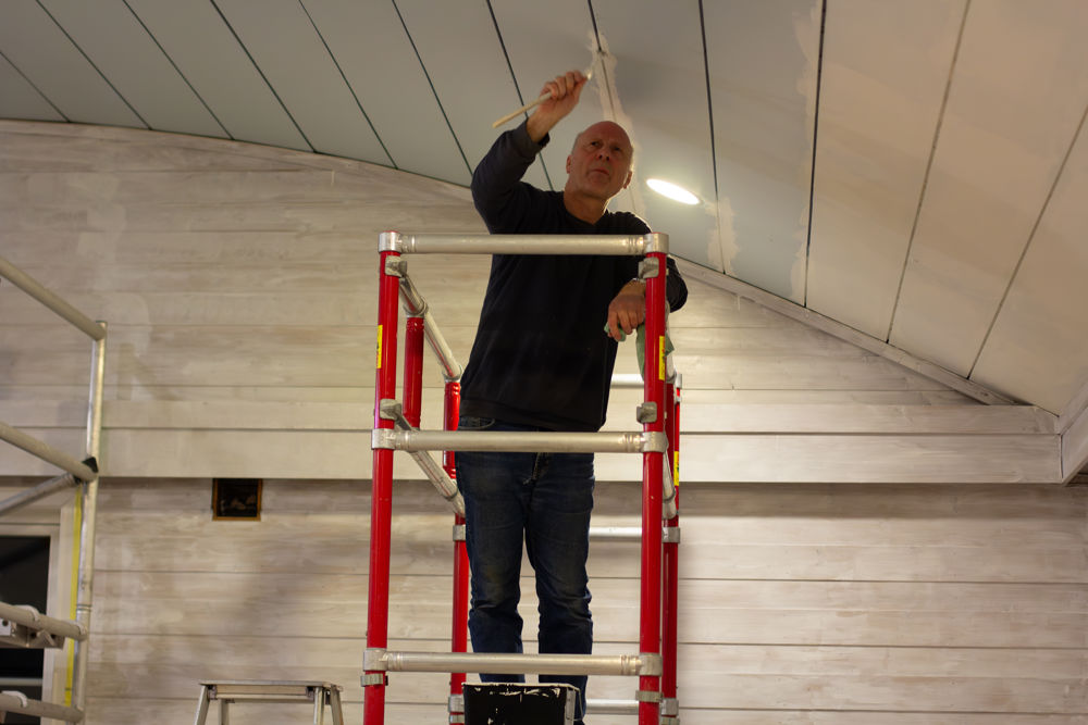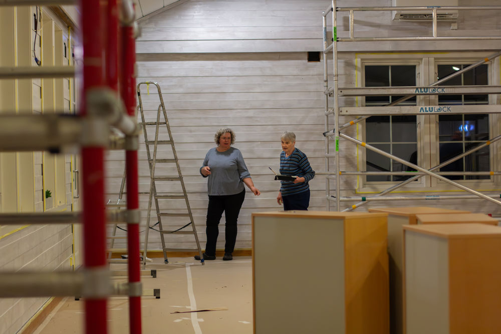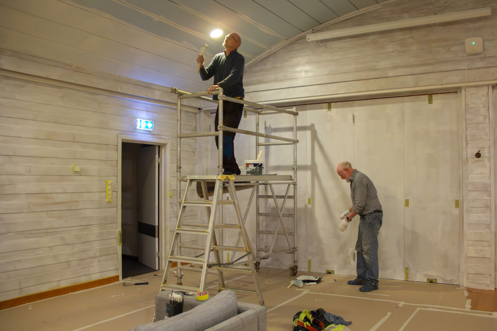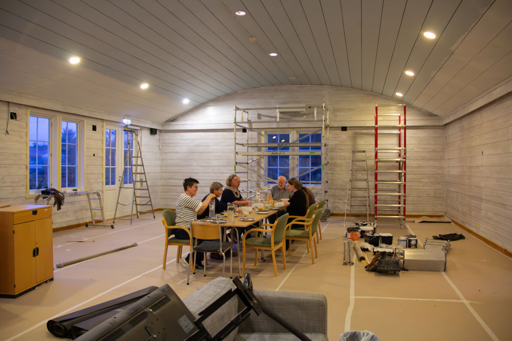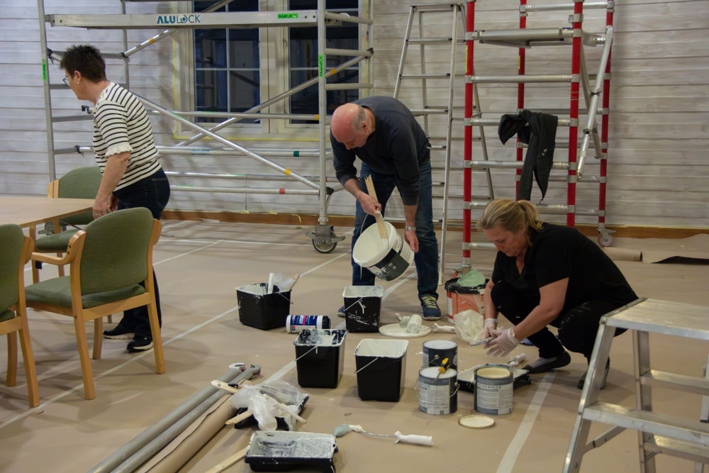 Ei eiga oppussingskomité vart sett ned i haust, leia av Mali Hjemdal, og no er arbeidet godt i gang. Førre veke stod vasking, førebuing og grunning på planen, og denne veka er målinga for alvor i gong. Heile salen er tømt, bortsett frå nokre møblar. Golvet er dekt med gråpapir, og listverk og karmar er teipa nøye. Fleire flyttbare stillas og stigar står klare rundt i rommet.