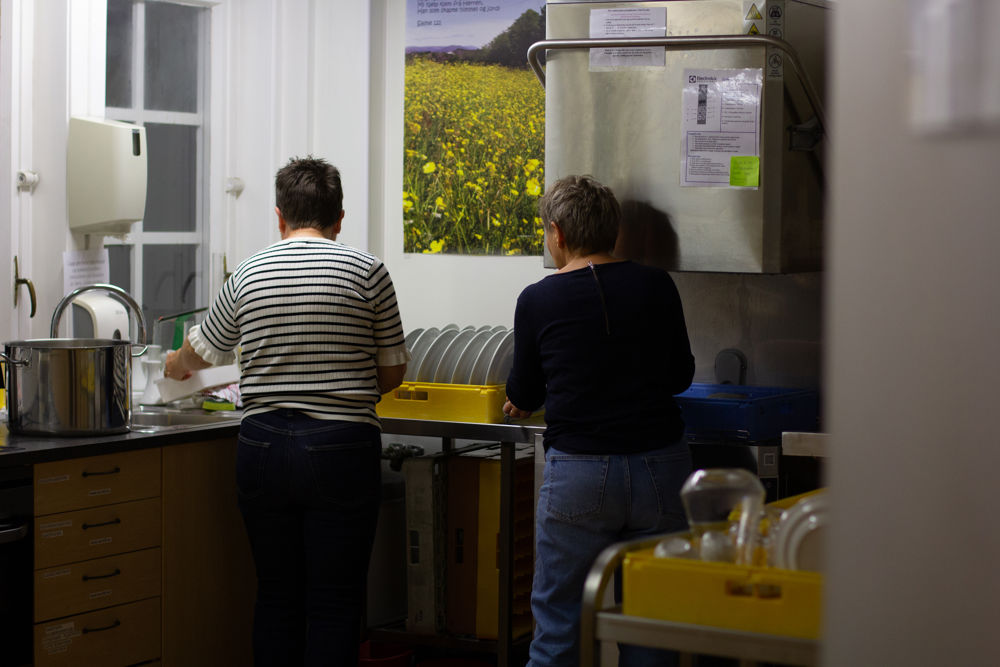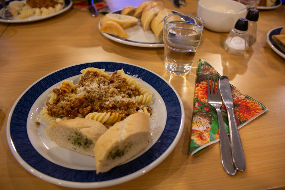 Men før malekostane vert tatt i bruk, startar ettermiddagen på hyggeleg vis: kjøkkengjengen har laga middag til alle. Det er dekt på eit lite langbord midt i den store salen, og dagens meny bød på pasta med kjøttsaus, kvitløksbaguettar og parmesan.