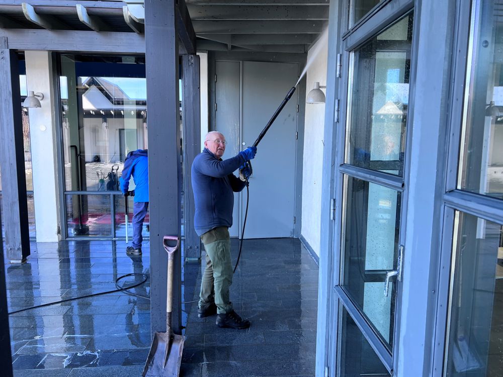 Innandørs fekk vi vaska ned hovudkjøkenet grundig. Utandørs vart det saga ned tre på nedsida av muren opp mot kyrkja. I tillegg vart borggarden og vegen kosta, og vindauge og veggar i borggarden og langs vegen opp til kyrkja vart vaska – så langt vi rakk.